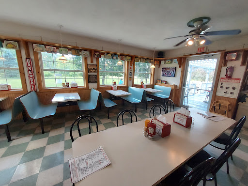 Great find of a place! It has a easy to find entrance with a generous gravel parking lot. You could probably stop to eat if towing and be able to get in and out. They do have a icecream window outside. Once inside they have the menus at the tables, you seat yourself (and at the counter). Once you decide, order and pay at the counter. You get a vibration pager to alert you to the meal being done. They also appeared to have a take out shelf inside just past the first few tables. The food was really good, the fries were thick and perfectly crispy. The burgers were crazy July. Chili on the Chilli dog appeared to be homemade and very good. The chips served were crispy and perfect. The portions were generous and the pricing was great and didn't break the bank! You can sit inside where there is a good amount of seating. If not being used...there is more seating in the back half of the building where they also have some games for playing. They also use that room for arge groups and rentals according to the sign. Back there it also has a atm and a change machine if needed. Great retro theme all throughout wiith plenty to look at and keep you occupied. Ice cream for desert is a great way to end ...or begin your meal! They do have some outside seating and a little playset for lids to have fun on and burn off some energy. Can't wait to come back again when...