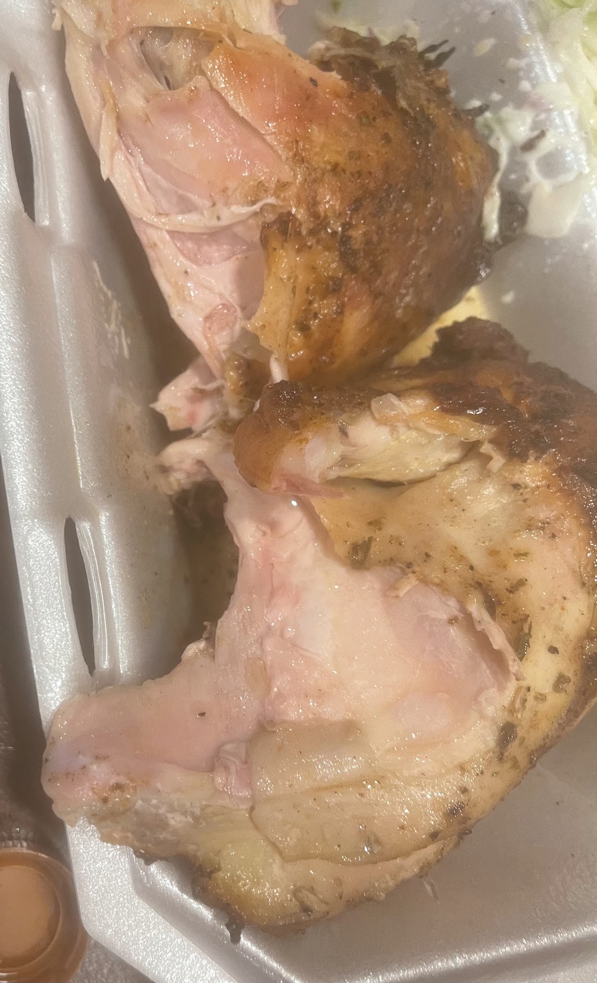 The meat is just lip-smaking great! The chicken has a marinade that isn't overly vinegary and thd ribs aren't covered in a bunch of barbecue sauce- they are beautifuly seasoned, full of juicy meat, and nearly fall off the bone.