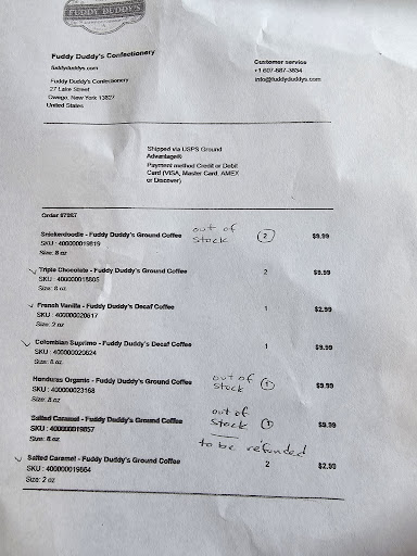 I ordered coffee online a few days ago. 10 bags to be exact. Fuddy Duddys shipped my order with nearly half the items I ordered out of stock.... Previously, months ago I at least recieved an email informing me in advance that they were out of stock. Unfortunately, this time was NOT the case. It was just a complete shock and disappointment as I opened the box with just about half the order not present. Its a shame, I would've liked to know beforehand because these are gifts for family that's in town only for a short period of time and my family members are not from New York...