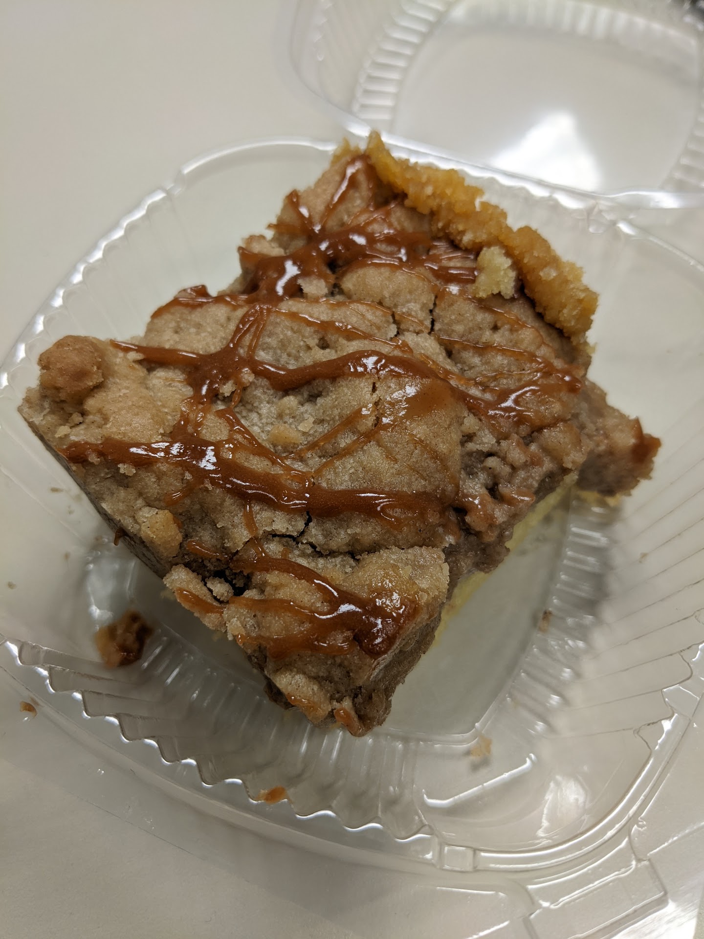 I had a blueberry muffin while there, and took a cup of light roast coffee and a coffee crumble cake of absolute delight home. The muffin was soft and just the right amount of spongey, not heavy, and definitely had real blueberries. The coffee was just a normal light/breakfast roast with half and half (they have non-dairy creamer options, though. I saw almond milk, I think). I am honestly not sure if they had any fancy coffee drinks but I also did not even look at the menu...glass case containing fresh goodies was pretty overwhelming but neatly displayed and had my attention from the start. I ate the coffee cake or apple crumble or whatever I got later and it was amazing. Crumbly on top, cake underneath, not too sweet. Could have been a breakfast or dessert.