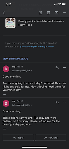 Ā Ā Ā Read moreTreats weāre very good....however the customer service is awful. I ordered 3 business days before I needed my products with next day shipping. Not only did they not arrive until 2 business days after I needed them but they did not reply to 2 emails I sent asking for help/refund of next day shipping charge