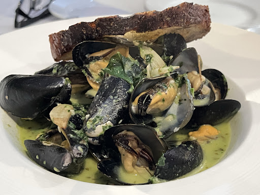 Signature dishes include: •Almond-Crusted Chicken Breast stuffed with artichoke hearts, spinach, & Asiago cheese . •Branzino Filet pan-seared and served with seasonal vegetables . •Pappardelle Bolognese & Black Linguini with Shrimp and Calamari, showcasing the house-made pasta’s quality . •Banana Napoleon, a standout dessert featuring caramelized banana layers.