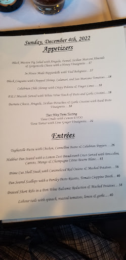 This was date night and I asked if they minded us sharing dishes. They were happy to oblige and they brought each course divided on two plates - nobody does this anymore - its old school service. We began with Whole Baby Baked Clams with Garlic Oregano Breadcrumbs. Small is better in this dish but more difficult to prepare without the clams turning rubbery - these were tender and moist with a slightly crispy topping and perfectly seasoned. Next came Warm Fresh Mozzarella atop sliced and sweet perfectly ripened beefsteak tomato drizzled with top-shelf basil infused olive oil then finished with a roasted red pepper and artistic slashes of syrupy aged balsamic . . . incredible. Next came fresh black squid ink pasta with shrimp and tender calamari. This was a special that night and I could've kept ordering and eating this dish until they shut the restaurant down - it was that good. Next - the entree was another special that night. Have you ever had a perfectly cooked piece of fish? You must consider this dish . . . Crispy-seared Halibut with fresh vegetables and a slightly sweet sauce made with a perfect veal demi glaze - we could actually smell and taste the roasted veal bones. This ranks as one of the top five fish dishes I've had spanning decades of sustained high-end Gluttony. Lastly - desert and a double espresso with a shot of Anisette. We shared but could not finish a terrific coconut Crème brûlée - excellent as well.