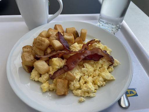 I go for the Bacon & Eggs plate, that comes with some potatoes too that are pretty dang good. Itâs real basic and cafeteria quality, but a pretty big portion size that you really canât complain for $4. Back in the pre-covid days it was $1.50 which was a ridiculous stea. And if you sign up for the free IKEA Family thing, you get free coffee or tea.