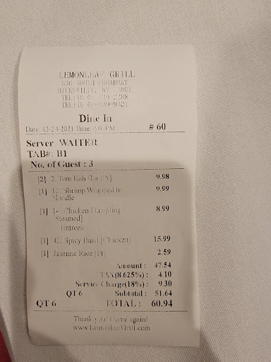 Read moreI just left Lemonleaf Grill in Hicksville and I could not be more annoyed. We ordered a steak medium-rare, and it came out well done. My family sent it back and was going to switch it to a duck dish instead, but the manager told us it was dry and better to keep with a steak, so we trusted his judgment. The second one came back about 15 minutes later after we finished the rest of our food, and it was now rare bordering raw. At this point, we just wanted to take it off of our bill. It took us almost 20 minutes to get a waiter over to the table and upon request of removing the item from the bill, they said no since the steak was cooked twice. They wanted to recook it for us, but at that point, we had been finished with our meal for over a half-hour and wanted to get home. We also did not trust they would be able to cook it right a third time. We deducted the amount from the bill and left the restaurant only to have the manager follow us into the parking lot demanding the additional money as well as an 18% service fee for the worst service ever. In the end, we were forced to pay the additional fee as the manager would not move from behind our car. I have been to this restaurant in the past and have never had issues like this. This will definitely be the last time my family eats there. I felt a need to let others know how they treat their customers. If I could I would have given this...