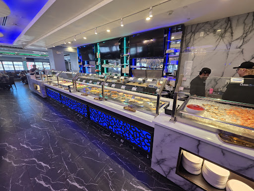 Read moreSaw this new location and decided to dine here for an early dinner. Prices were reasonable, even for dinner. Very spacious and modern dining areas on both sides of the restaurant. Like the wine and liquor glass displays separating the dining/waiting areas and food service areas. Food buffet area is somewhat centrally located in the restaurant. Nice sushi/sashimi/raw seafood bar area with decent selection. Hot foods/hibachi/grill, salad bar, and desserts were located in a separate section where you "step down" to. Decent variety of hot/grilled food, but felt like limited selections; not sure if the hot foods area being cramped made it felt like that. Smaller section with desserts, but had a decent variety, including soft serve ice cream. Some grilled food like the pork sausage and pork belly were overcooked and a bit tough and dry. Most of the sushi rolls were ok, sashimi was very good, raw fish salad was good too. Fresh shucked raw oysters were very delicious. The roast duck had good flavor, but felt like it was cooked and sitting on the warming tray for a while and got a little tough/dry. Overall, the food was good, not great. May try again, since I have not tasted all of the dishes. Service was good. Restaurant was generally clean. Atmosphere is bright and beautifully designed, but they are visible cracks in some of the marble wall tiles in some areas of the restaurant, especially the bathroom (possibly from shoddy installation of the plumbing fixtures). Shared parking lot in shopping center, but still has a huge area all around the restaurant with ample parking spaces.