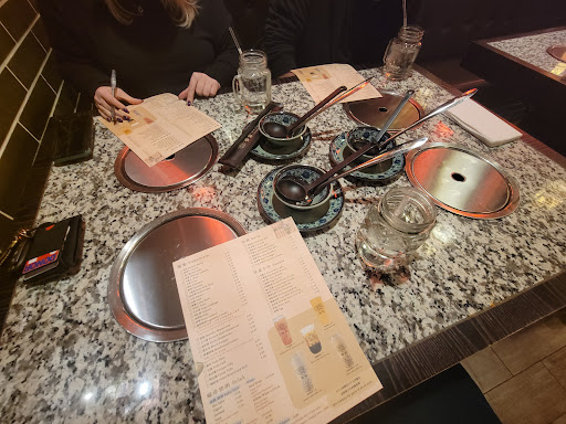 First time at a hotpot, and I was impressed! Let's start with the atmosphere. The restaurant is nicely decorated, has a cozy feel, and was pretty clean for the most part. This could be a date spot for sure, but by no means do you have to dress up. The service was very good. We were seated right away, and a waitress got us started with our orders. We had a couple of questions that were answered right away. There was an older couple who had a ton of questions, and the waitress literally walked them through everything. Even took them to the back to show them the sauces and extras. They were all polite, and I really can't rave enough about them. Now for the main event, THE FOOD! Ordering was simple, check the boxes you want, and that's it. Any mistakes can be fixed since the waitress goes over it with you. We opted for a large, 2 soup bowl. It was tremendous in size. We actually didn't finish it. We picked the mushroom broth and the pork leg broth. The mushroom one was light but strong and had mushrooms already cooking in it. The pork was a rich creamy white with some type of sweet fruit and corn in it. For mix in stuff, we went with a combo 1 just because it was easy. All 4 meats had strong flavor profiles, but the beef and pork belly tasted similar when cooked. The veggies and fungus cooked up very well, and the lettuce held so much broth flavor. The noodles were a pain in the butt to cook, and that's the only thing I don't think I'll order again. We did order the spicy beef tripe for an appetizer, and it was fantastic. The texture was good, not too chewy. And the flavor was so strong. Highly recommended as long as you don't mind what it is. Overall, it was a wonderful experience and I'll come back. Next time, I'll try a smaller...
