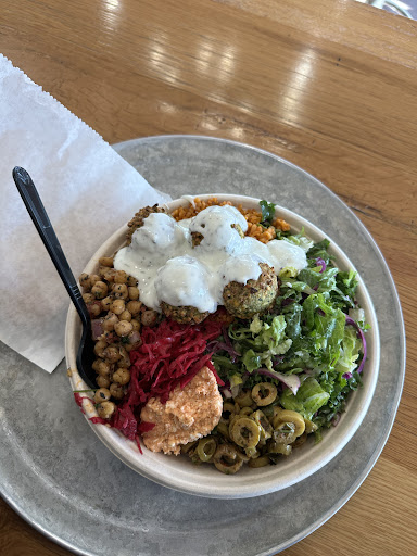 Upon walking in, the workers got ready to serve us, which was really nice to see, rather than feel unwanted. They have a lot of different protein options, great for anyone who is vegetarian (or possibly vegan). I got a salad and rice bowl with falafel and the kale mix. You can choose up to 4 toppings (unsure if there is a charge for more, but im sure it’s not much). I chose the spicy feta, olives, red cabbage, and the chickpeas as my toppings. I also got the greek dressing- which was perfect in my opinion because it had the saltiness I love in a vinaigrette. I also got the yogurt dressing on top as well, which was very creamy and refreshing, breaking through the acidity. I mix my bowls together, so I can’t specifically point out things about each ingredient, but they mixed very well. The falafel wasn’t dry and I believe they made it to order, which was nice. The serving size was HUGE. I ate maybe 1/3 of my bowl, but that’s fine with me because I can have it again. The workers were very sweet and helpful. They had plenty of seating and a lot of windows, making the space very open and great to go with friends or family for a quick lunch. I really enjoyed it and will...