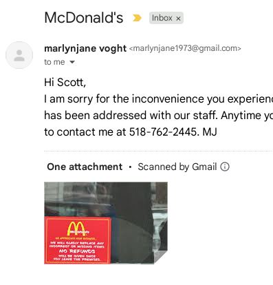 Let me contrast this terrible experience with one I had at Little Falls McDonald's the following week. Waited in line for like 15 minutes at the drive through. Got to the window and the shift manager apologized and offered me a free meal next time I came out to their restaurant. Palatine McDonald's take a lesson in customer service from these guys. Once Dunkin comes in to Palatine you'll no longer be the only fast food I don't have to get out of my car place in town. Step up your game or get...