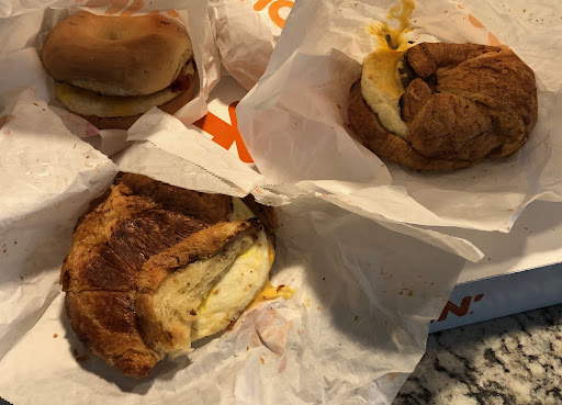 I have shopped at this Dunkin Donuts multiple times because it is so close to my home. Admittedly the donuts are ok most of the time if they have not run out of anything (which they frequently do later in the day). Where this location falls so far short is with their breakfast sandwiches. I once stopped into the store (IE not drive through) around 8:30am to pick up breakfast sandwiches for my family and I kid you not, I was told that they were not serving breakfast sandwiches because it was too busy!?!?!?! I was not sure how to reconcile that with any sort of common era business thinking but I left and went somewhere else. I recount that event simply to preface the current encounter I had this morning. I went through the drive through and ordered five breakfast croissants... two with bacon and three with sausage. I get to the window only to be told they only have two croissants left. So I say fine... just give me the balance on English muffins. Nope, they are out of them too. It was 10:00am. So I opted for bagels and we left the drive through. I get home and open the sandwiches and I have to say... I have seen more appetizing things hacked up by my dog. I am not sure why this Dunkin location can't seem to get its quality and presentation in check. If you want donuts they seem to come through 80% of the time as long as it is not too late in the day where their selection gets limited. If you want breakfast sandwiches... maybe try another location or another business. I think the picture...
