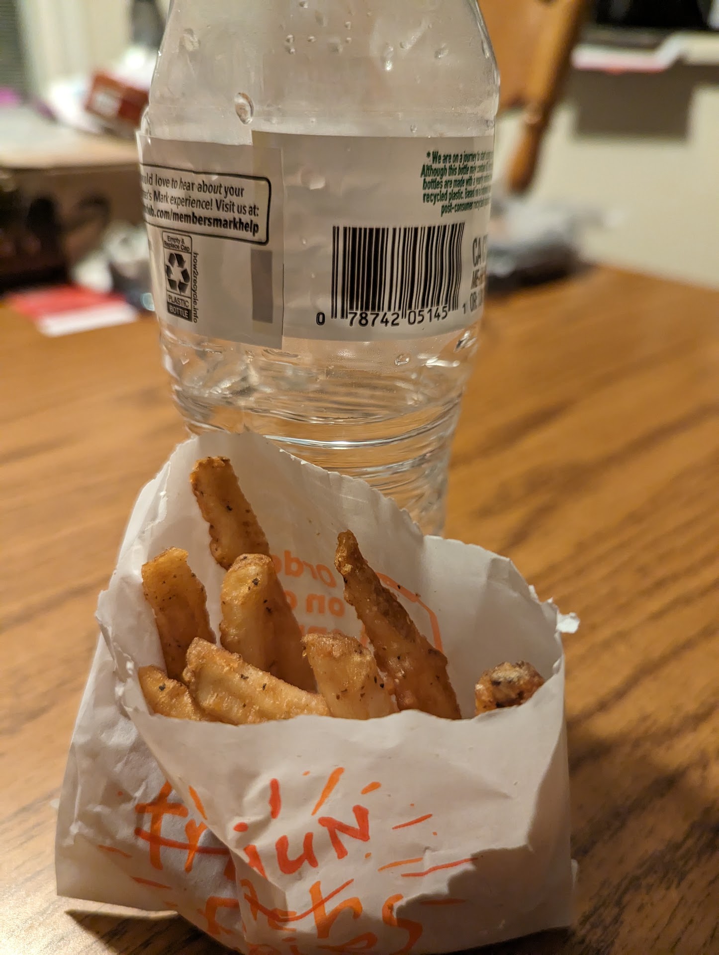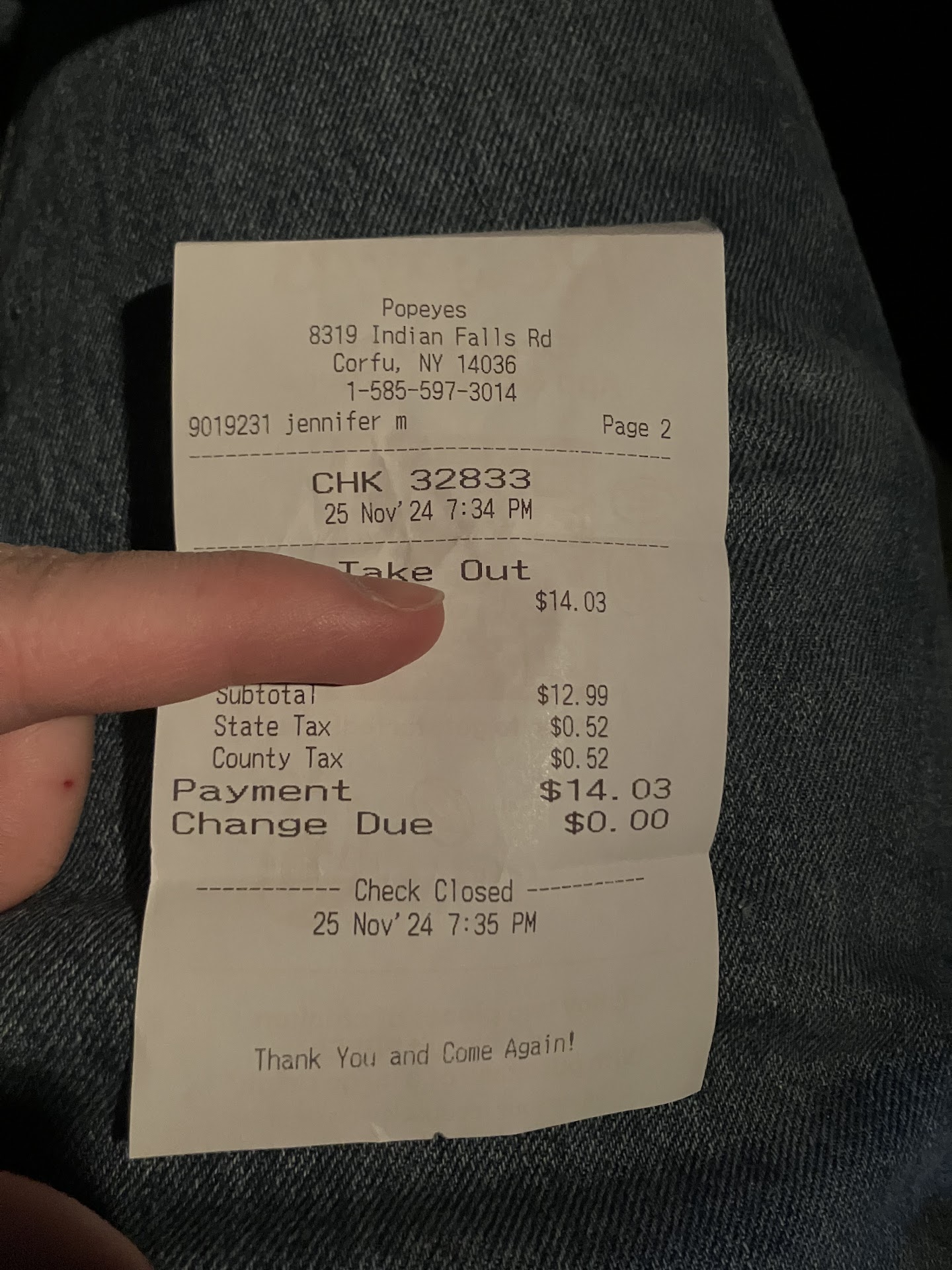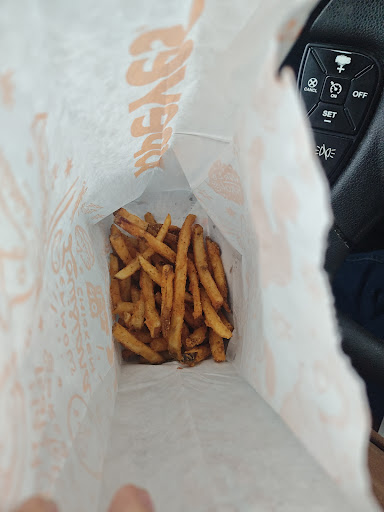Rest stop was crowded because of the buffalo game earlier than the day. We waited longer to get our food then we did to place our order. It seems like they lost our ticket for a while because people who ordered after us who had similar items got their food first. We ended up being there for over 45 minutes from the time we got in line until we got our food. Ordered two combo chicken sandwiches. The sandwich cost about $8, the combo which only included cajun fries and no drink, cost $15.39. When the food was finally ready, my husband who had ordered his sandwich without pickles, got pickles anyway. The size of the Cajun fries order was ridiculously small: especially for costing $7. They were cold to boot. The water bottle is in the picture for size reference. The amount of fries in the bag is exactly the amount received. At least the sandwiches were hot and...