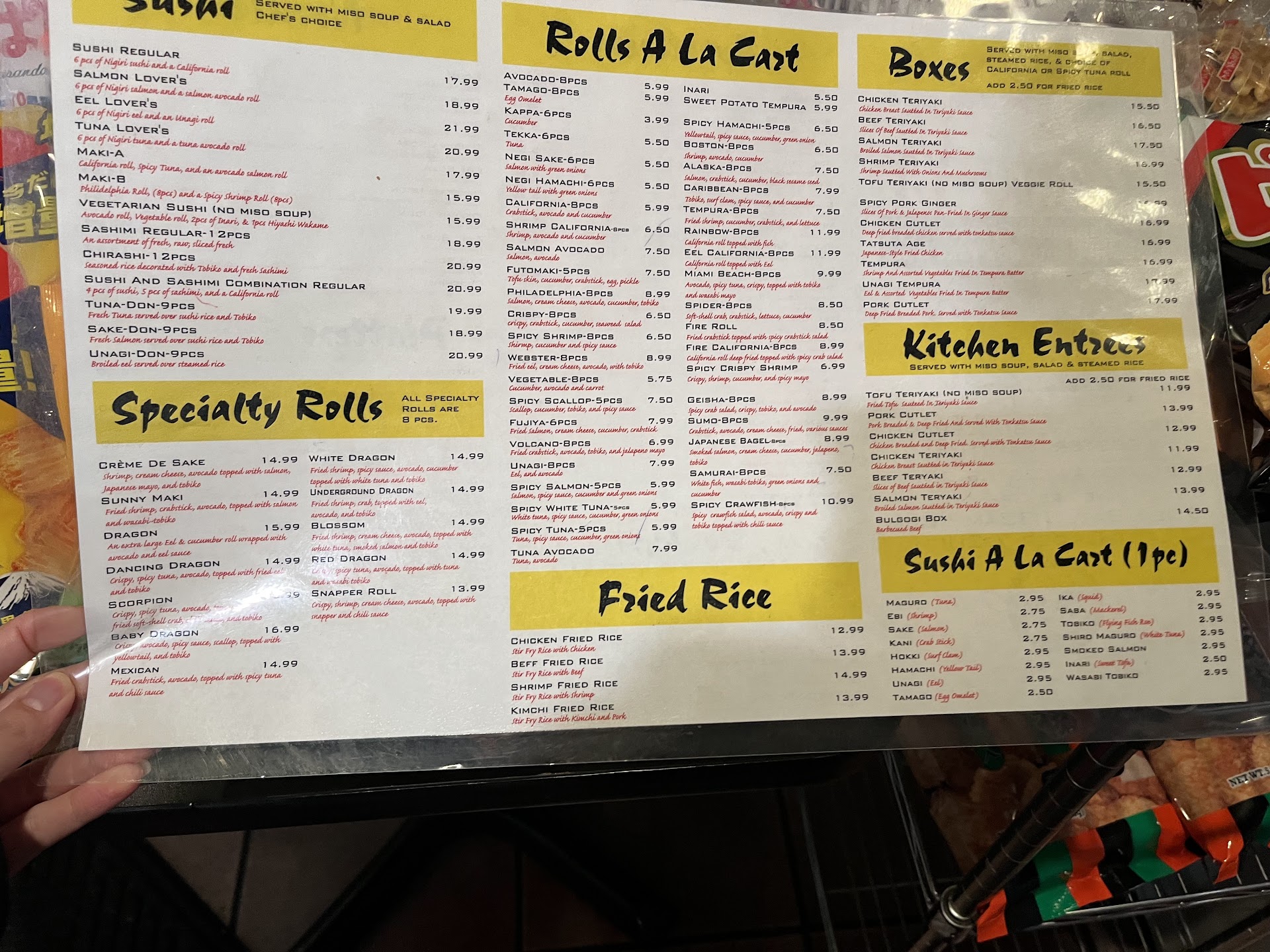 The store is small the menu is at the register and also on the wall behind the register. They have things very similar to pure sushi restaurants.