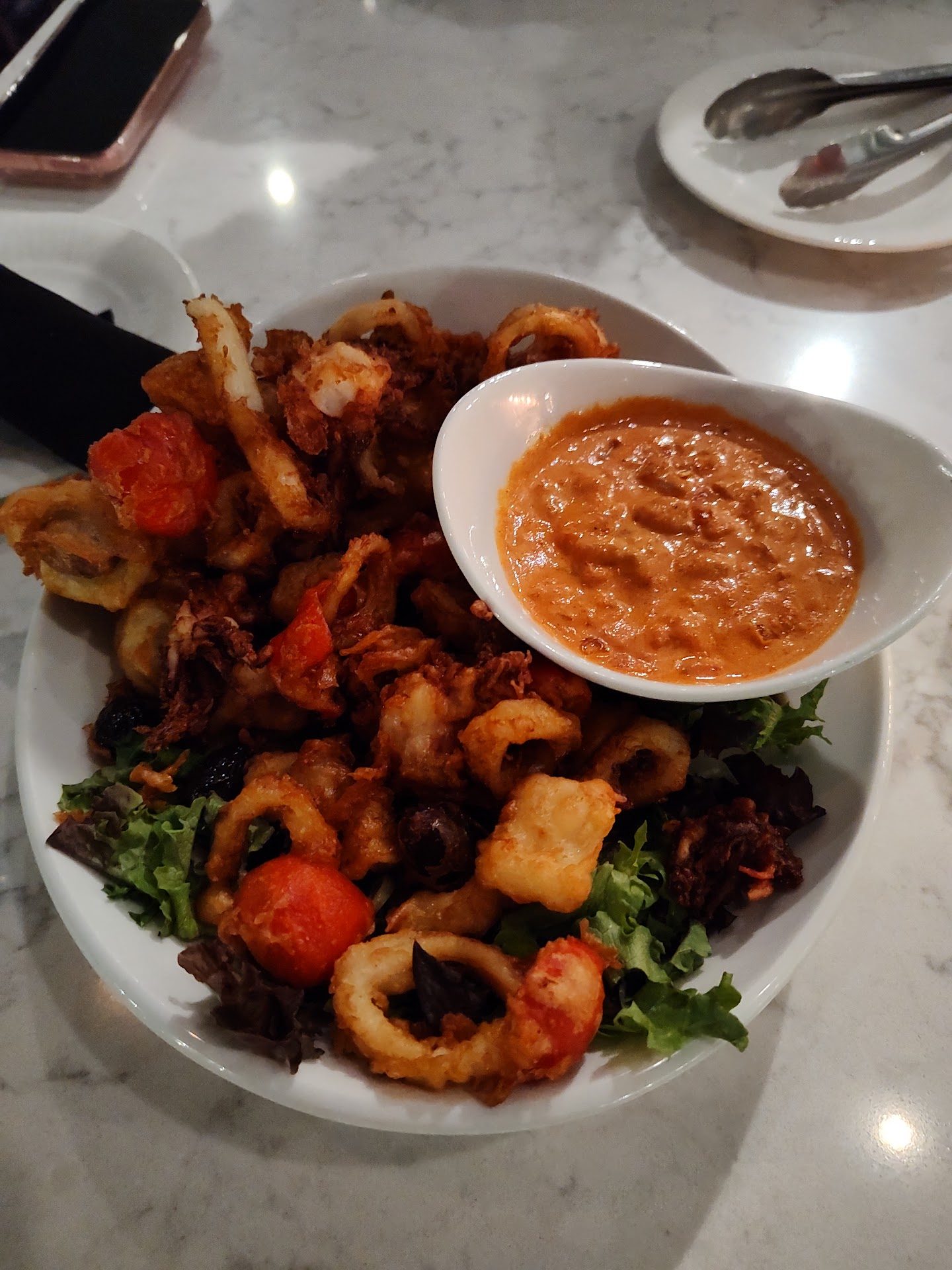 We started our evening with some cocktails, which were creative and perfectly mixed. A great sign of things to come! For an appetizer, we went with the calamari, and it was cooked to perfectionâlightly crispy and not at all chewy, with a delicious dipping sauce.