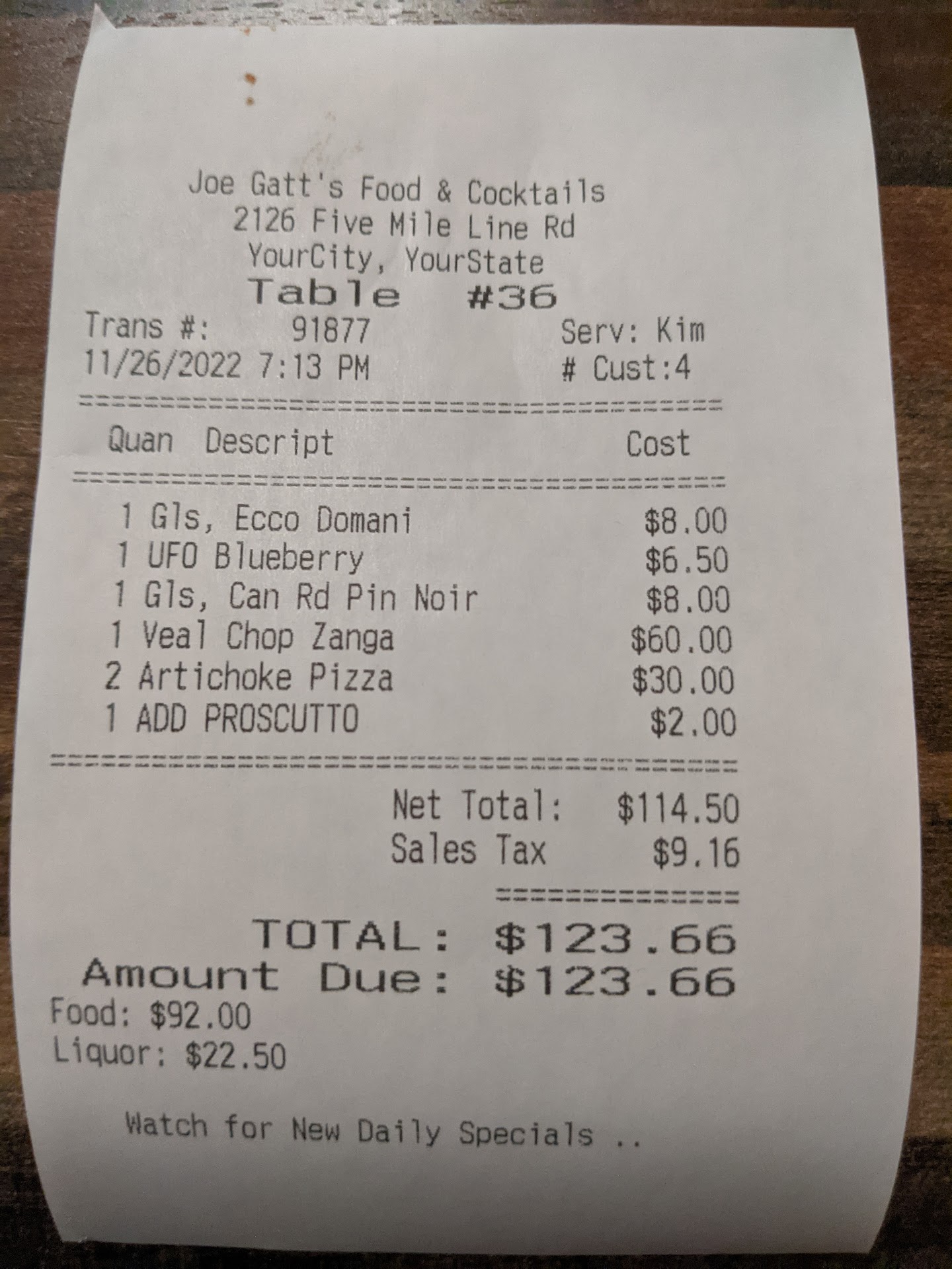 š Specials were rattled off like a monologue. No printed menu, no referenceājust a long-winded explanation of 2 appetizers, 3 steak options, and 3 veal dishes. It took 15 minutes to get through it all, and we were expected to remember everything. Please, just print the specials.