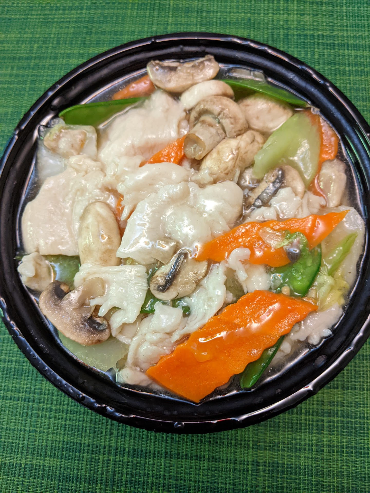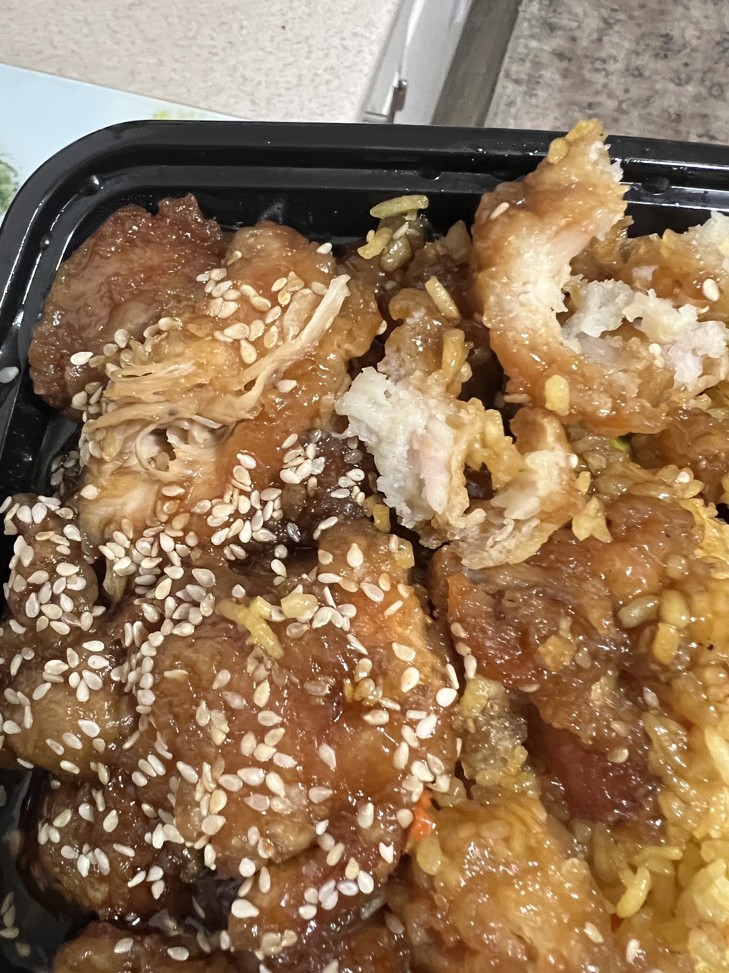 The chicken looked grey in color. I told my husband I didn’t feel comfortable eating it. I took two bites of chicken and there was just a nasty taste in my mouth. I moved to the lo mein I ordered. It was so bland and dry. The chicken, if that’s what you want to call it, tasted like it was premade and left out and then refried. The sauce was so gelatinous and everything was stuck and clumped together.