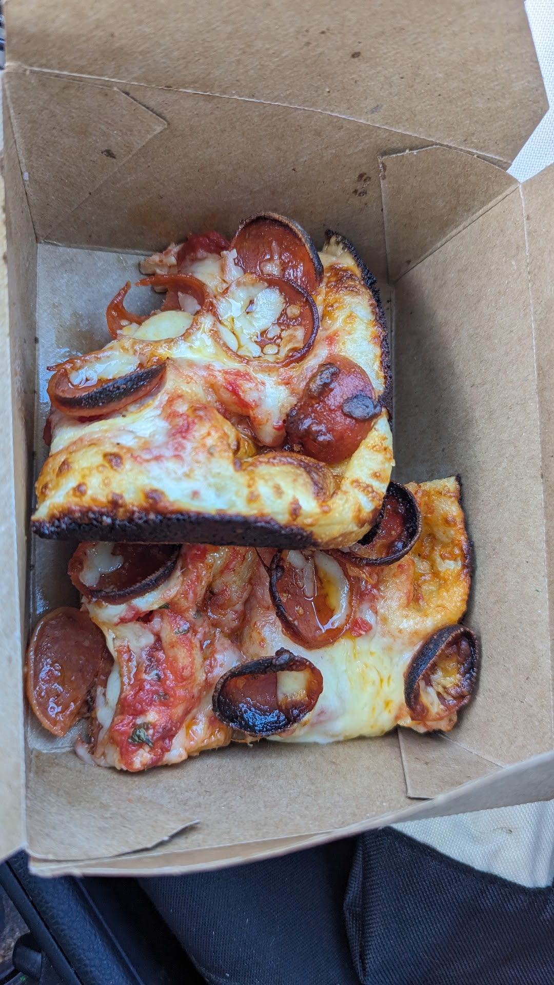 This is a good square slice. The dough has a good flavor and the bottom is crispy. I just had a pepperoni slice but today they had a special slice that had bbq beef on it that looked great. But I always know if I try the special slice that no matter how good it is I’ll wish I got the regular slice. Especially when it’s the first time there so I didn’t succumb to my own pressure.