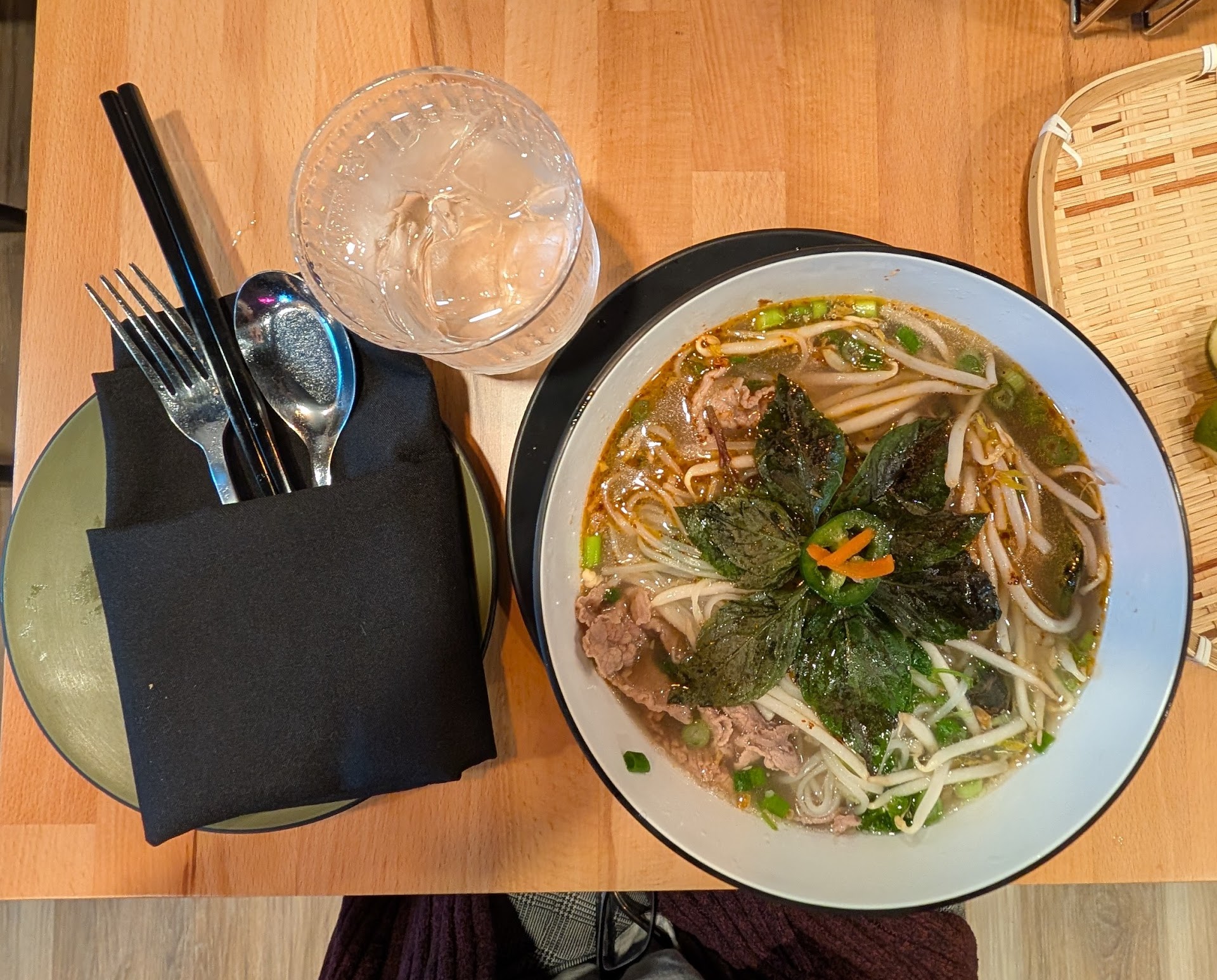 Overall a good experience! Was really excited to try this new vietnamese place as a lot of other ones are further out in Rochester. I ordered the Bun bo hue (spicy beef noodle soup) - it wasn't spicy but they come with chili oil and sriracha on the side for you to add in). The broth was good but arrived warm and not piping hot (which is essence of pho in my opinion) and the brisket was really tough to eat. The other things in it were tasty though. My husband got the grilled pork vermicelli bowl and he said it was good. We both got non alcoholic lychee spritz which was good. Just that when the bill arrived they charged us $20 for 2 instead of $8 for 2 but they fixed it when I mentioned it. I think it was just an honest mistake considering they just opened so it's not too big of a deal. The atmosphere is cute, very dimly lit which I feel fits more of an evening vibe. It would be nice to have the lights brighter during the day. But overall, it was a good experience! The waitresses there were very nice and friendly and I would come back to try other dishes...