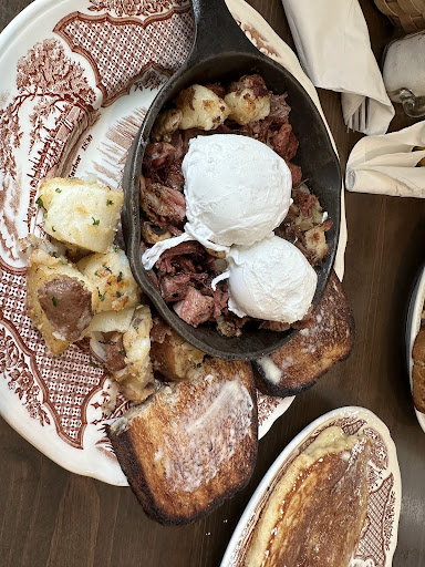 We have the Montre Cristo (French toast, rhubarb jam, and Swiss cheese—a somewhat surprisingly incredible mix!!) and the Icelandic, which were both divine. The whole menu is both accessible and elevated. Apparently these are family recipes which shows because they are PERFECTED!