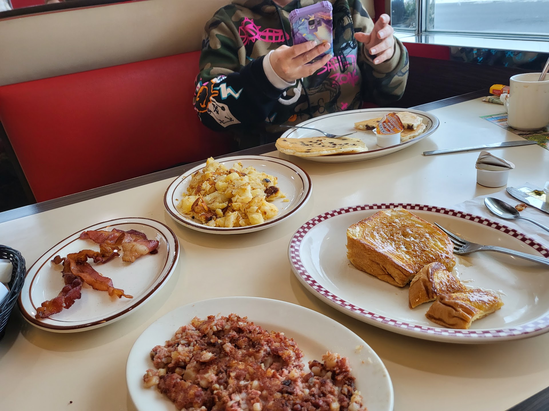 Mom had French toast, over easy egg and crispy bacon. Short stack French toast was a thick slice of artisan bread that included vanilla - fluffy and delicious. Dad had the biscuit and gravy. Holy cow if you order this be ready for the gravy train - so much rich sausage gravy. He also had a side of corned beef hash. He had to get a take home box. My man got the country breakfast that included eggs and sausage and gravy and home fries. He ate every bite. I sopped up some of his gravy with my toast and questioned my choice because that gravy was deeeeelicious. He also got a small orange juice. I got two over medium eggs with corned beef hash. It included toast and home fries. The portions were generous - I needed a take home box too. It was all so yummy - every bite was what you want for breakfast. We all shared tiny bites of our breakfast with each other and enjoyed it all. We all got coffee served in the typical diner coffee mugs that help to keep your coffee hot. This experience is what a happy diner meal with good company should be. We left like we had a meal - fat, full and happy!