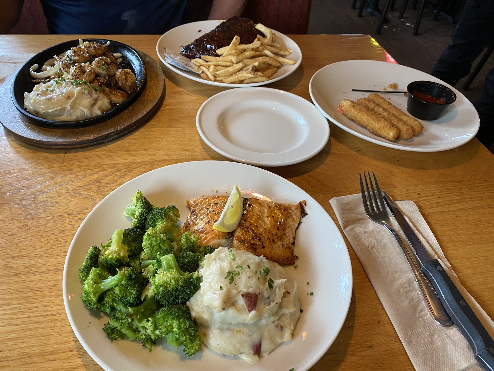 Went for an early dinner on a Saturday rainy afternoon. There was one couple ahead of us to be seated so our wait time for a table was about 5 minutes. Upon entering the restaurant we could see the bar was full and also the left side of the dining room was packed with families and screaming kids. I asked the host to seat us on the other side of the restaurant where it was very quiet with adults only and that seemed to be a problem to him. He really wanted to seat the two of us in the loud, packed dining area on the left side, but I refused to go there with him. The other (right) side had three couples, plenty of room and thatās where I wanted to sit, so he finally brought us over there. This was our first time at this location. It has been about 8 years since I last ate at the Latham, NY, Applebeeās location. I used to get āCar-side To-Goā once a week, but when they changed the salmon recipe, I stopped eating there because I did not like the newer version of the salmon dish they offered. We started off with a Whiskey Sour which was delicious. I ordered the Salmon fillet with mashed potatoes and broccoli. The salmon was so dry and overcooked! It was horrible! The mashed potatoes and broccoli were underwhelming and tasteless. They were barely warm! š I only ate half of my entire meal. Friend ordered the 2 for $26, which ended up costing 2 for $29 because the choices he picked had an additional charge. He ordered the Mozzarella sticks appetizer, the Bourbon Street Chicken and Shrimp, Garlic mashed potatoes and Broccoli along with the Glazed Baby Back Ribs, 1/2 rack. He couldnāt eat the Bourbon Street Chicken and Shrimp. It was too spicy and the Chicken was too blackened for him. He ate 1 bite. The ribs he enjoyed. He didnāt order fries and didnāt eat them. He was also underwhelmed by the taste of the mashed potatoes and broccoli. Our server did not come by to check on Us/our meals until we were already done eating what we wanted. Meal cost with tip was $75. We will not be dining at any Applebeeās...
