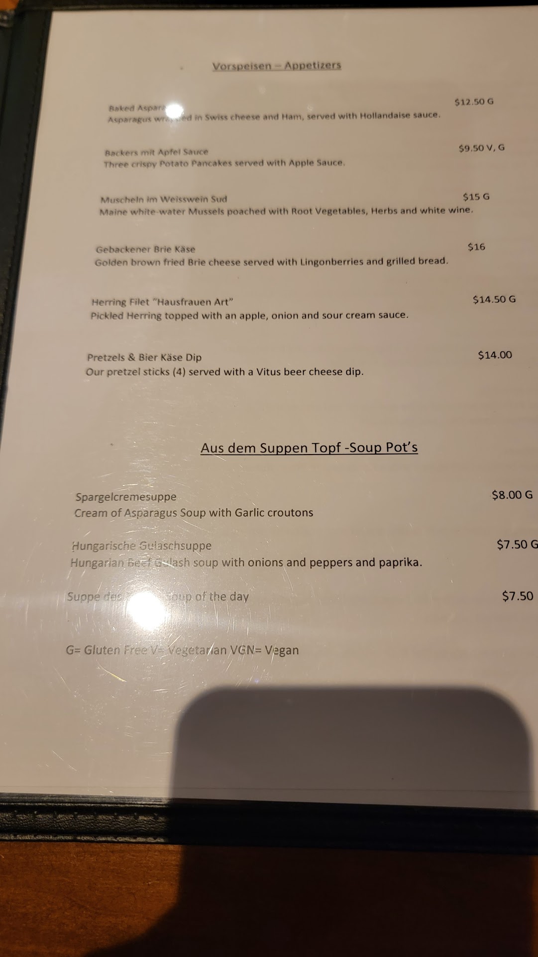 Where should I start? Excellent. Contemporary restaurant with german touch. Far from the Lederhosen-Nutcracker-Kitsch charme one could be afraid of to see, very clean, nice, quiet and relaxing restaurant with a bar in the middle. Just one large TV-screen at the bar area. The kitchen: we went there the 2nd time today, first was 2nd day after opening, today was Christmas Eve. The food is unique, almost everything is home made. The red cabbage with duck lard, and spices, cooked to the point, the Wiener Schnitzel is a must if you look for excellent AND authentic food. My wife last time had the sauerbraten, what was also extraordinarily, and she makes Sauerbraten herself in her cafe once per year, she knows what a good Sauerbraten has to be, and she was simply excited. The graved lachs: undescribable, you HAVE to try. I make this my own at home, and am proud to say, it is better than anywhere else. Cannot say that any more: the salmon is soft, it melts on the tongue, literally. It is made with bete, what gives it a minimal purple color, and a very soft, mildly-hot aftertaste. Might be you can some that good somewhere else: certainly you cannot get some graved lachs somewhere better.