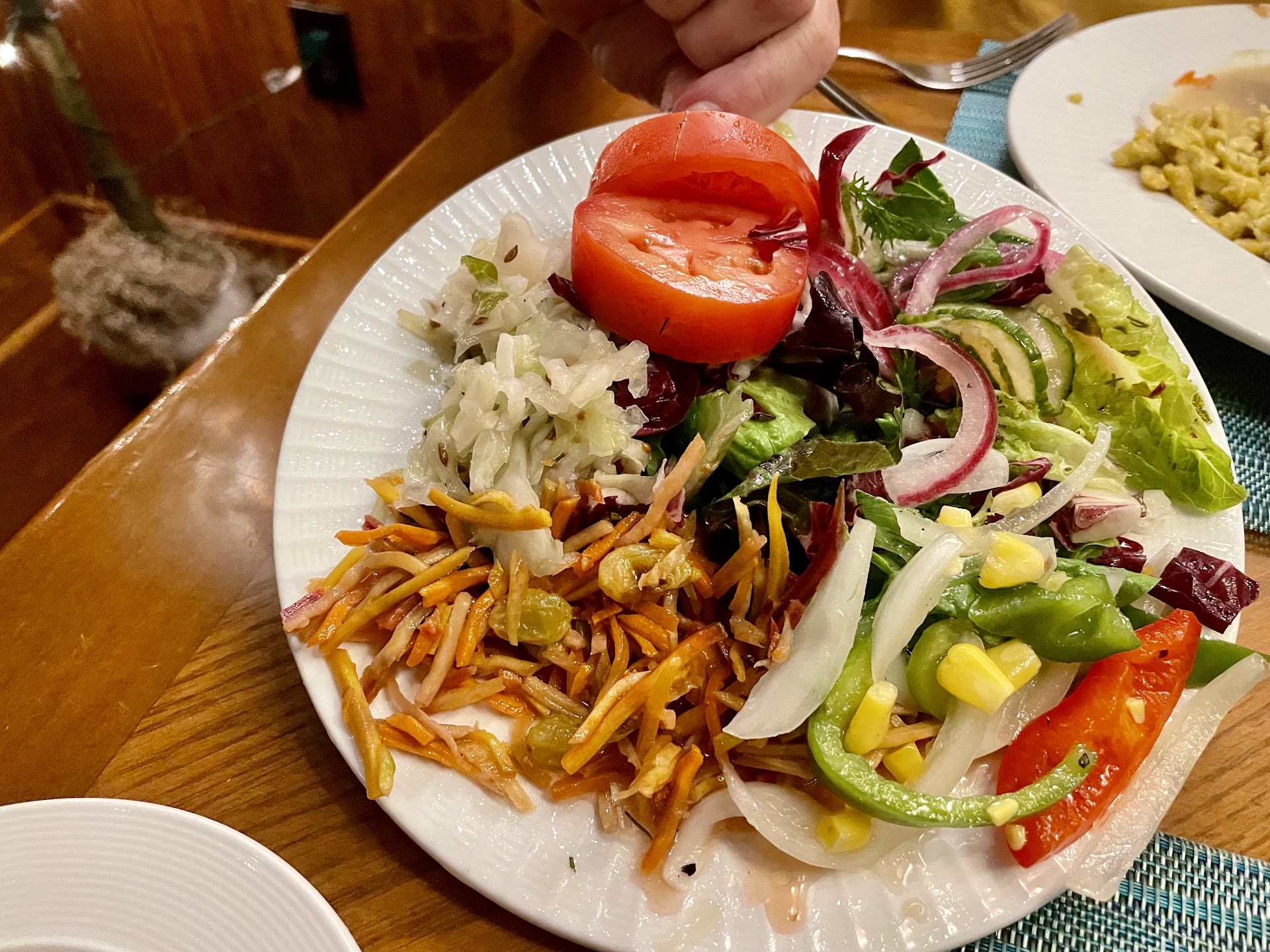 And: we had goose today, a staple for German Christmas, again with the already described red cabbage, and dumplings. The goose was excellent, alone the gravy... And the dumplings precisely on the point, tasty, great. Christian, please make at least the dumplings a regular on the menue...
