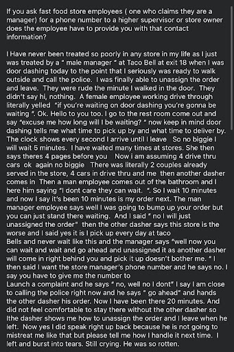 Read moreAs a Door Dasher I come to this location often and the service is never great but last night was especially atrocious. Per my door dash app instructions, I entered the store to check for my order on the rack. As usual it wasn't there - so I waited - not a big deal. I waited patiently for several minutes to be acknowledged by one of the workers. Myself and 2 other dashers. It was around 20 minutes! No one was at the counter and one of the workers was swearing the whole time about how upset (to say it mildly) he was for having to work while others went home and refused to make the Door Dash orders at all though everyone was waiting patiently. This went on the entire 50 minutes I waited for my order. 50 minutes. Run back the cameras and you will see this. Even after being acknowledged by the worker, the order took another 30 minutes to make. It was only a couple of items. There was no need for the angry employee to treat us poorly. This also cost me on my income and rating. Absolutely disgraceful how someone can treat perfectly polite strangers with such hostility. Did I mention the scene he made throwing food around the kitchen right in front of us as he couldn't hold his temper in - dropping the "F - Bomb" every other word out of his mouth? Again, I recommend you run the cameras back. I will be reaching out to corporate. This was the worst customer service I...