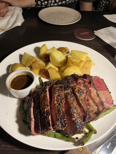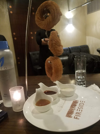 Read moreThe restaurant simply does not earn the astronomical prices it charges. The decor is somewhere between rustic-chic and just plain old neglected/too cheap to decorate more. The dishware is not ceramic. It is plastic, made in China. The service was fine. One of our requests (putting the steak back on the grill so that it wasn't raw) was met with an eyeroll. I got the impression this reaction was more out of frustration with the frequency of this request from the clientele than out of frustration with our specific request. They start you out with bread for the table served with insipid olive oil and actually quite good garlic confit. The rolls were very sweet. We ordered a meat pizza (East Side, Chicago style crust) and a 20 oz bone-in ribeye. The meat pizza cost nearly $40 and was good. Some of the meat tasted overcooked; the crust tasted sweet, very much like it was made from the same dough as the table bread was made out of. The 20 oz bone-in ribete steak was billed to us by the waiter as the softest as the softest steak available. As suggested before, the steak came out about 8 minutes after we ordered it and, unsurprisingly, it was not even rare the first time around. I asked them to please return it so it could reach the medium-rare we ordered. When it came back, it was properly medium-rare. But it was very difficult to cut and chew because of how tough the meat was and overcooked the outside was. It also didn't taste like much. They probably forgot to salt it. We're never getting back those wasted $90. For dessert we ordered churro doughnuts. They were good. $19, three doughnuts. All in all, because the food was edible and sometimes good, the place was mostly clean, and the service was generally decent, Fireside gets three stars. It might have received a fourth if the prices were better matched to the...