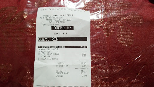 Read moreMy daughter ordered from popeyes as a walkin and after she ordered 1/4 popcorn shrimp combo and a surf and turf combo. It came out to 24.09. After she paid for the food, the so called "supervisor" Moe tells her they don't have any shrimp which was 90 percent of the order. We asked for a refund and Moe said he could not give her a refund only could exchange for another item but they barely had any other options. No mild tenders,no shrimp,no white meat,no dark meat,no nothing. Only Moe offered my daughter the nuggets and which I then I had to ask, "Can she at least get a store credit." Moe tried to tell her no. Finally, an associate advised that he can give her Store credit. She advised the receipt could remain in the back and allowed me to take a picture of the receipt. She remained very professional unlike Moe the supervisor was snickering in the background. He was very disrespectful and does not deserve to be a supervisor at Popeyes. Like for pt2, when my daughter goes to her redeem...