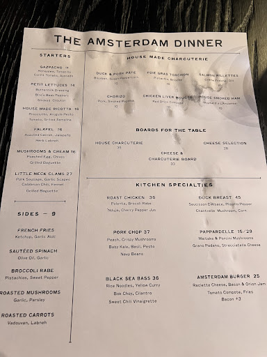 If I had written this review prior to Saturday night, I would've given the Amsterdam a very rare five. We've eaten here several times for brunch & dinner, and never had a bad meal. After eating here Saturday night, I'm settling on 4 stars. Service has always been friendly and attentive, and has never been a problem. The food has always been delicious and well prepared. The meat and cheese platter is my favorite and we generally order it each time we visit. However, on our last visit, I made a reservation and did not realize until we arrived that I did not have a choice of seating when reserving. Previously, when making a reservation, I had the choice of the porch, downstairs dining area, or upstairs dining area. The porch is lovely for brunch and the upstairs dining area is perfect for an intimate dinner when we have a rare child free evening to ourselves. The market in the downstairs dining was removed since our last visit and converted into more dining space, which is where we were seated on our latest visit. It's a nice space but not as intimate and cozy as the upstairs dining area. I'm not sure the upstairs dining area was open on Saturday but I would've much preferred sitting up there in a less cavernous space. We arrived 20 minutes prior to our reservation and they graciously accommodated us and seated us early. I'm assuming due to staffing shortages, they had limited staff working because most of the dining room remained empty while we were there despite a sign at the entrance saying they were fully booked for the evening. My one major complaint is that in the time since we first visited the restaurant, the menu changes very little. Appetizers vary seasonally, but entrees remain the same and there's generally one burger, one seafood dish, one pasta dish, one pork, one chicken and one duck dish that rotate sauces/vegetables. On our latest visit, I asked if there were any specials and the only option we were offered was a portion of three scallops to be added to any dish for a cost of $22. We recently went on a beach vacation in Delaware and I was able to get a scallop entrée for not much more than that. On this most recent visit, I had the duck entrée, which was a whopping $45. The meat was good and flavorful and well seasoned and cooked properly, and I understand costs have risen, but it was not a $45 dish in my opinion. Our prior visit was a bit less than a year ago for our anniversary and the Chinese five spice duck entrée I had then was much more interesting and cost less. There was nothing wrong with my entrée, and the corn accompaniment was quite tasty and hearty. I felt my husband's pappardelle needed another minute to qualify as al dente, and though tasty, again, it was pricey considering there was no protein in it. $29 for noodles is steep. Cocktails have gone from $15 on our last visit to $17. The cocktail list does not change very much and generally there's one tequila/vodka/rum/Mezcal/gin etc cocktail on offering. The cocktails are very well-made but at $17, they should be. Costs on each item have risen a few dollars and I understand food costs are up but with rising food costs, comes increasing standards. Food and service have to be exceptional and unfortunately, our last visit fell short. The downstairs dining room felt like eating in a bar with a dining room attached, albeit a more upscale one, and I missed the ambience of the upstairs dining area. There was nothing wrong with our last visit, but there was nothing really exceptional, either. We'll be back, but perhaps next time for brunch. I can't help but feel that on our most recent visit, we ordered less than we normally do but...