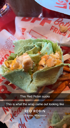 Read moreThis place is absolutely filthy.chunks of who-knows-what all over the bathroom door, the purse hook, the mirrors, and the entire floor was just covered with junk. There was a crate full of dirty dishes and ketchup bottle sitting out in the open on the floor by the bar. I came in and waited for 5 minutes for anyone to recognize that I was there. several empty tables were covered with food debris. Fortunately, we walked to the bathroom before or during, and we walk right back out the front door. I told the hostess about our reason for leaving and, very defensively, she said it was because they were busy. I told her that wasn't an excuse, I've been in restaurant jobs my whole life and this was definitely a sign of a poor manager and a lazy staff. I should have known better since the last time we were here, a year ago while passing through town, we ended up getting my burger comped because I was served a glutton bun when I ordered gluten-free, and when I pointed it out to the waitress she told me I was lying, slammed my plate back on the table when I handed it to her, and then when I asked to get the manager, she screamed, literally screamed to the point where everyone in the restaurant turned around, and swore at me on her way to get a manager. We love Red Robin in Appleton and in Green Bay, but don't bother going to the Wausau one. Disgusting and...