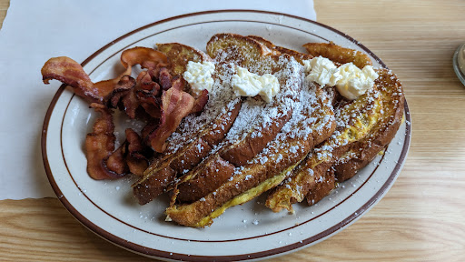 The French toast arrived with bacon and I had to ask what it was because I couldn't remember if I have ever been served six huge slices of what appeared to be perfectly dipped, browned, powder sugared, and fresh smelling happiness. I ate a few pieces and it hit the spot.