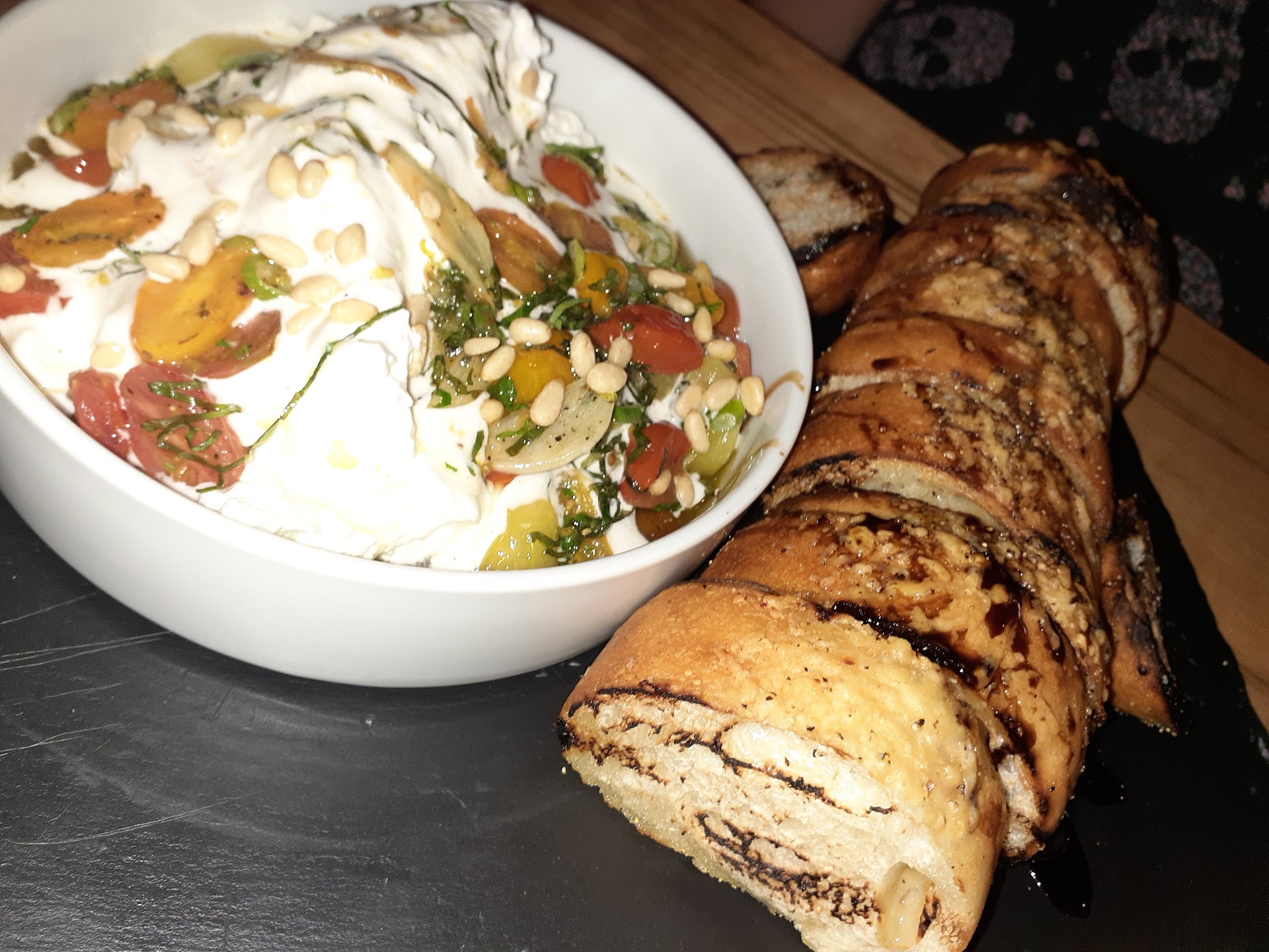 We started out with the Whipped Feta app: a heaping bowl of savory fluffy greatness, garnished with Grape tomatoes, pine nuts, herbs, garlic and Shallots. Served with a whole loaf of sliced grilled artisan bread and drizzled with Balsamic glaze. WOW what a show stopper! Highly recommended!