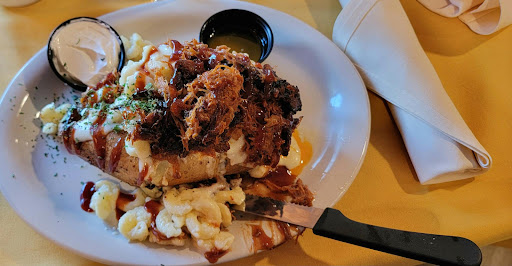 I’ll be honest I haven’t been here yet. My mom asked if I wanted to go last week but I was working. She went, got herself something Togo, then she brought in her best friend in a few days later, then she went back to get her other friend takeout the next day. I went to her house today, she is all excited to get something for me & my husband. She had so many compliments, the portions are big, the owner was there to greet her, and she went on about how she doesn’t like potatoes but she almost ate the whole potato. Her friend (known to be a picky eater, a good cook, & usually only eats a bit was full but just kept eating because it was so good) My mom isn’t internet savvy so I thought I would share her review for her. I’ll update once I eat there myself. She also said it’s bright (the chairs are yellow) & she thought the art on the walls was fun. I’m excited to try it out, thanks to my mom I have a copy of the menu (it’s not just potatoes either) & I checked out their facebook. It does look really good!! Ps: the other exciting part for my mom is that they will be open year round. I was very surprised by the low prices too! My moms really...