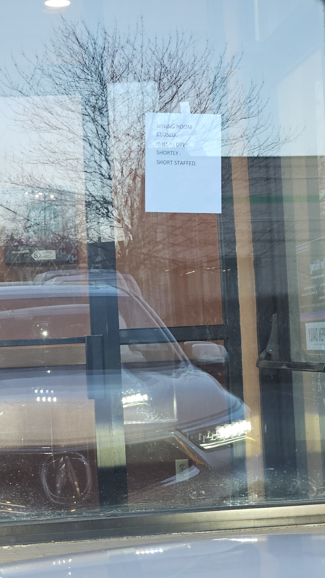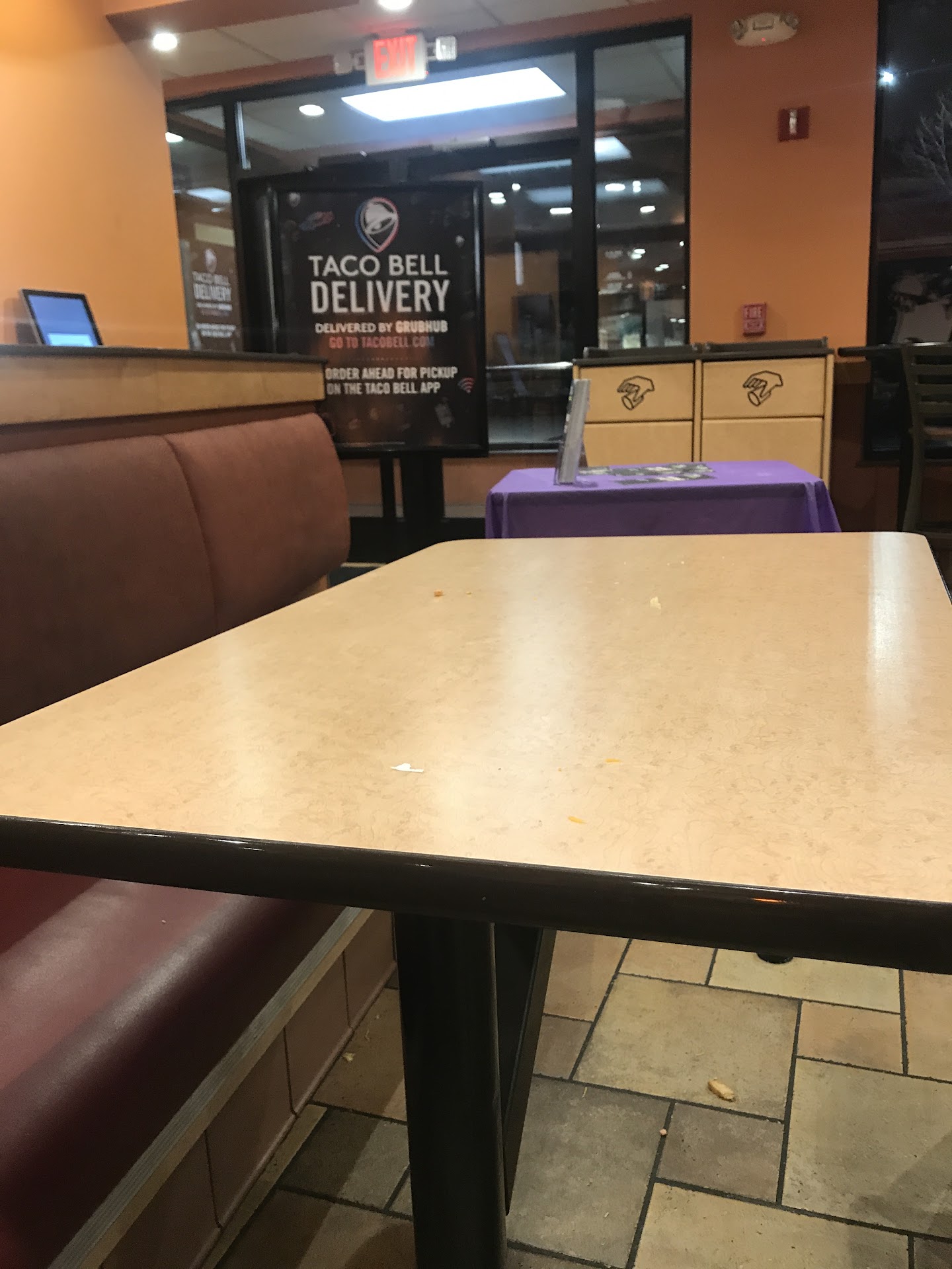 We come here frequently, usually using the drive through, however we opted to come inside today. The pictures are what we saw when we entered and the service wasn't much better. Maybe two people making food, one person walking around with a lime green earbud in one ear and headset on top of his head. Also gloves weren't changed between touching the screen and food and in between handling various other items. Tables weren't wiped down, floors not swept, etc. Our order was placed at 8:57 and it has taken over ten minutes for our food. One person ahead of us (possibly GrubHub?), no one else here. Finally got our food at 9:13.