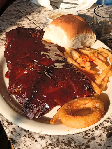 I imagine it was because of the $11.99 ribs special. My roommate and the 3 other people at my table ordered them. I can't eat a lot but stole a couple ribs from his plate. They were tender and had just enough sauce to make them juicy. I ordered a Mojito to drink, nice lime and mint, very refreshing. For dinner I had onion rings. A huge plate, golden brown fried deliciousness. And the best part of the meal for me was the chili. Not too spicy and a great smoky flavor. I usually order chilli because it's easy for me to digest, and if I had known how damn good this chili was I would have ordered a bowl, not just a cup. It really was very very good.