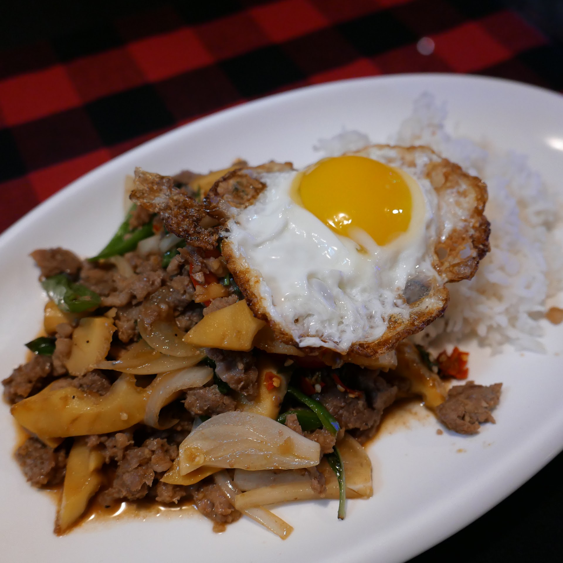 Food This is obviously the most important factor. I tried 'Pad Gar Pow,' which comes with a choice of protein (including tofu, chicken, pork, beef, squid, shrimp, duck, fish, seafood, and scallops) served with fresh garlic, onion, pepper, bamboo, and sweet basil. The rice served is jasmine rice, not fried. I chose pork. Additionally, there was an option for spice level: medium and hot. I chose hot because I enjoy spicy foods. It was really great—lots of toppings, great sauce, and spicy enough to enjoy. If you're not comfortable with spicy foods, I would recommend going for medium or mild (if available).