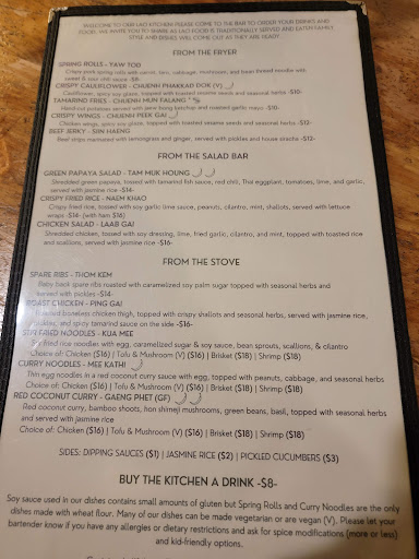 Food wise, we were fascinated by the Laotian cuisine and started with spring rolls and tamarind fries. The fries had just a touch of sourness from the tamarind that paired well with either the garlic mayo or the spicy ketchup. For the main we split an order of the curry noodles with shrimp. The shrimp were large and tender, the coconut balanced out the curry in the sauce and the cabbage added nice texture. We quickly ate all of that dish. We finished the meal with an amazing sticky plum cake. The cake was warm and moist and sweet, the toffee glaze a rich and indulgent way to top of the evening. For drinks, I had flight of beers ranging from hazy IPA to a malt brown ale. The rye saison was particularly for with the curry noodles. My wife had a house-made hibiscus Laos soda with botanical gin. Sweet and definitely would be refreshing on a warmer day.