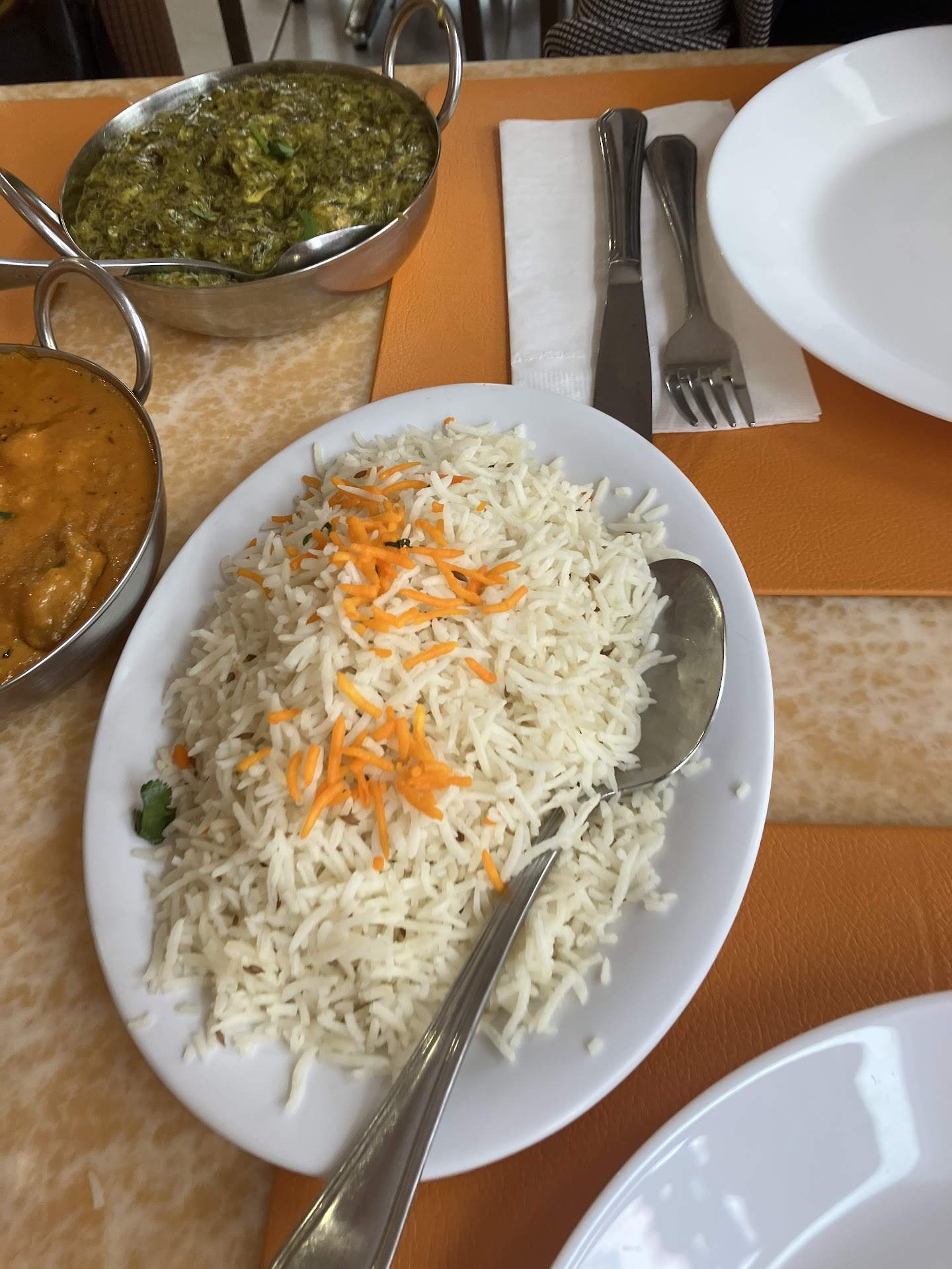 Within minutes of placing our order, the dining area’s air was filled with smells from the kitchen. Something real was happening. The sensual complexity of Indian food, whose multitudinous scents I’ll awkwardly describe as bristling, sweet, unguenty, thorny, puckery, and the like, were upon us. And once the dishes came, unlike the smell, say of peanut butter being superior to its actual taste, the flavors of our dishes were dazzling. Rich and creamy, the Shahi Lamb Korma was tender and plentiful. The Aloo Gobhi Mas, a gustatory complement. I more than once asked my partner not to talk and closed my eyes while feeling the food. The Palak Paneer, decent. The Garlic naan, perfectly chewy and sprinkled with coriander, the latter being a real sign of a caring chef. It's also worth mentioning that the server gave us options over how spicy we wanted our food prepared. We were so happy with our meal that we overate, the way sometimes at an amusement park I have—out of delight—ridden one topsy-turvy ride too many, and made myself, as a consequence, a bit sick.