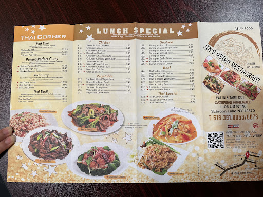 Read moreA real NYC-like Chinese restaurant in the Lake George/Schroon Lake area. They told me that they were originally in Brooklyn. There are a few tables but their business is mainly take-out and the menu is mostly Chinese dishes but there are also some traditional Thai dishes as well. We had steamed pork dumplings, egg drop soup, sweet and sour shrimp, General Tso's chicken and a house special lo mein. Jin's is a welcome addition to the...