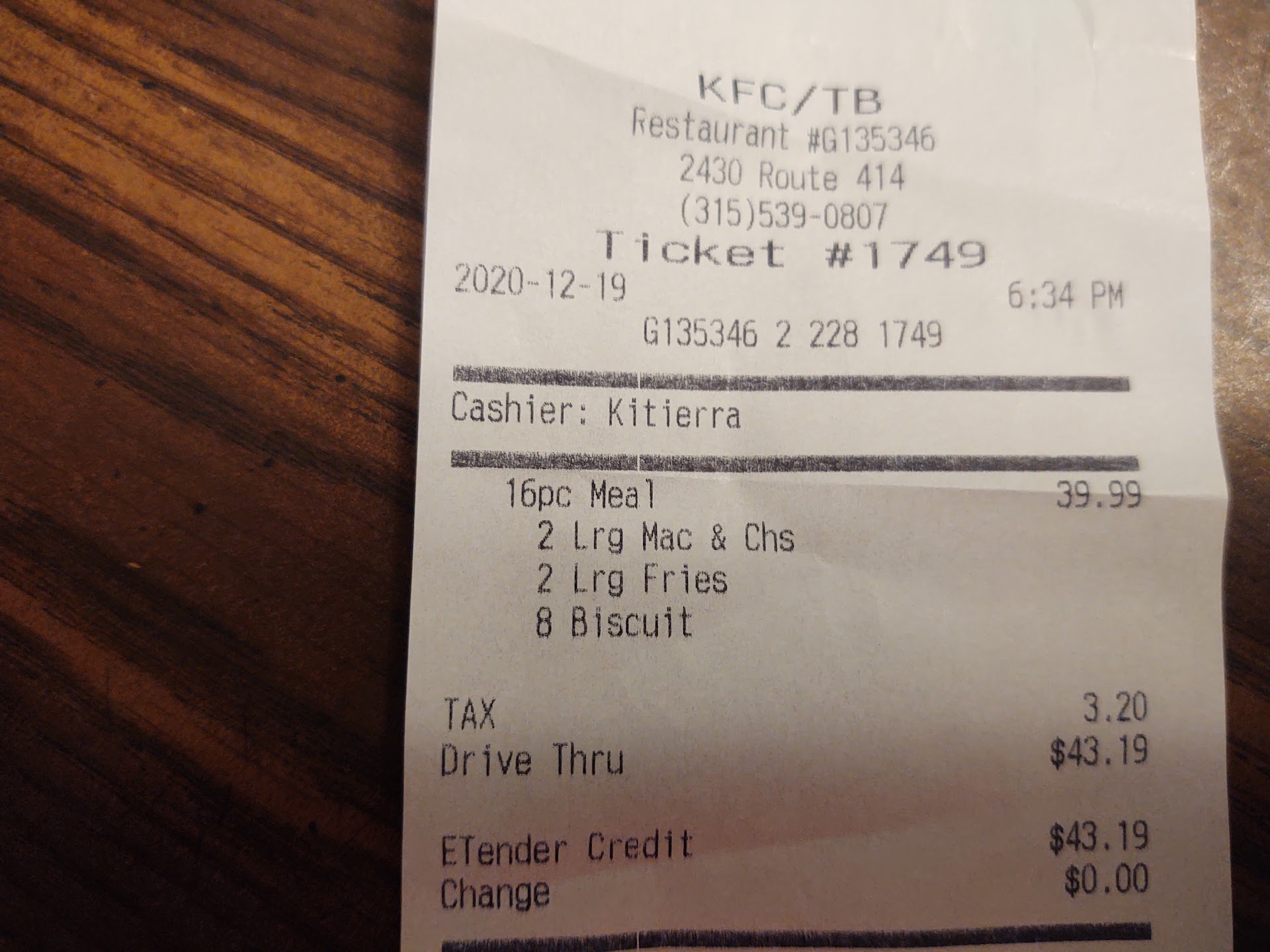 Read moreOh where do I start... You know i worked at this establishment for a very short time, years ago. You hear so many rumors about this place only about half are true. Im not going to get into detais. But from my personal experiance latley my food is incredibly inconsistent. I would have to say 9/10 past visits ive had my order was either missing items or food was improperly constructed and therefore un appealing. Frequently they run out of soda and tea. Probonly the dirtyest most outdated bathrooms between geneva and auburn. This past november of 2017 myself and at least 9 other customers witnessed a known manager swearing and putting down 2 other employee's (yelling loud enough people sitting in the dining area stood up to see what the issue was). To make maters worse my order was incorrect and i waited neerly 12 mins for my order and the woman behind the counter said drive through customers come first and i need to be patient... I almost threw my drink at her. My most recent visit i placed neerly a 50 dollar order to feed 6 adults. After waiting 9 mins for my order to discover i had food missing only to wait anothe 3 minutes for someone to decide to go over my recipt and the food i was given. Then to wait another 14 mins for them to produce the other half of my order. I have no sudgestions for tb/kfc your just a broken restraunt and litterally no one seems to genuinly care not the cuatomers not the people who work there not managment. Im just discusted. I only go back to watch everyone struggle i know if my foods wrong before the serve it to me. Someone...