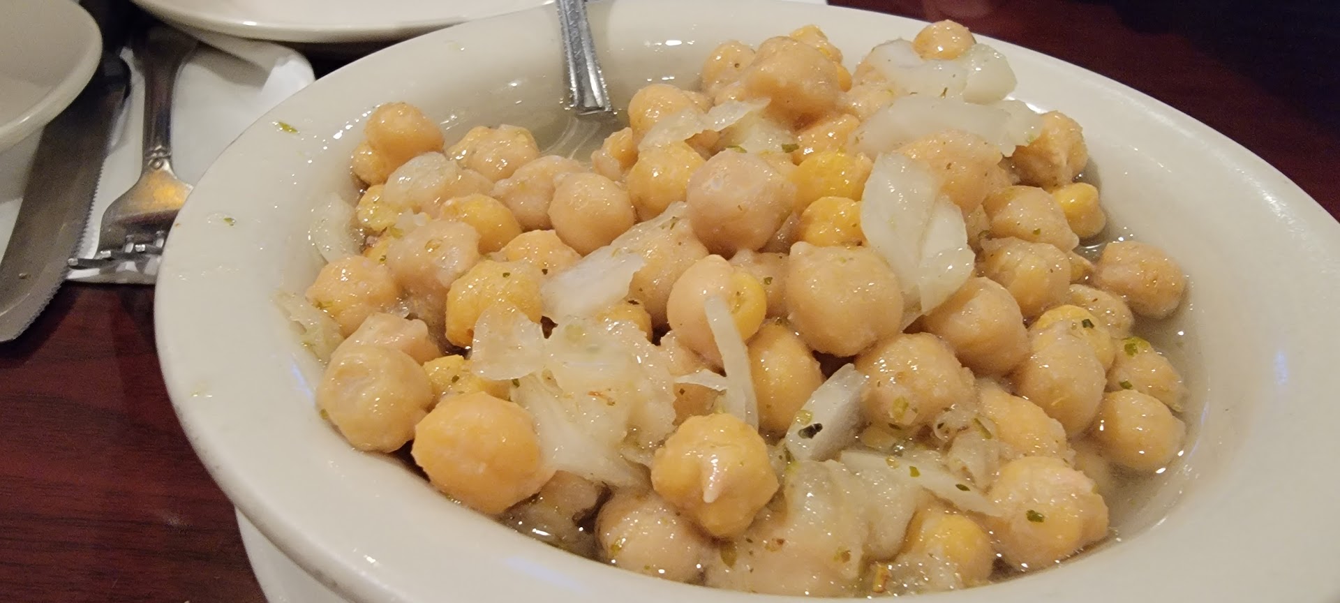 When we arrive the immediately brought us pita and chickpea salad. The chickpea salad is made with a very light vinaigrette chickpeas and onions. It is very simple but so delicious. The pita is warm out of the oven and cut into quarters and they brought us yogurt sauce to dip in.