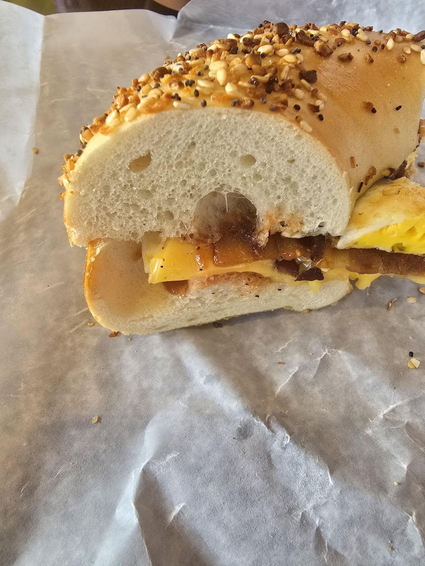 I ordered online to pick up and my service dropped so I called back. The same gentleman answered and was very nice and patient, took my order and I forgot to ask for salt, pepper and ketchup on my egg sandwich and he kindly asked if I wanted to add it so kudos for the attention to detail. I arrived and parking is sufficient and it’s right off the main road so it’s easy to access. The Chinese lady greeted me at the counter and was genuinely nice and warm toned and asked if I was there for pick up. My breakfast was ready and she rung me up for $6 and offered me a free coffee which I declined. They sue take debit with a $5 minimum and they use a modern payment device so no pin is needed if you don’t mind that and paying is instant so no waiting on that end either, I was in and out in less then 3 min. The place had a decent amount of seating and was very clean and the customers seemed to be enjoying themselves. This place is a winner and sets the bar high for the other establishments in the area. I ordered an everything bagel with 2 fried eggs, sausage and pepper jack cheese (my only critique would be that they did put a very thin slice of cheese I would have liked to taste more of it) and it was delicious. Thanks again Bagel Express I will be back!!