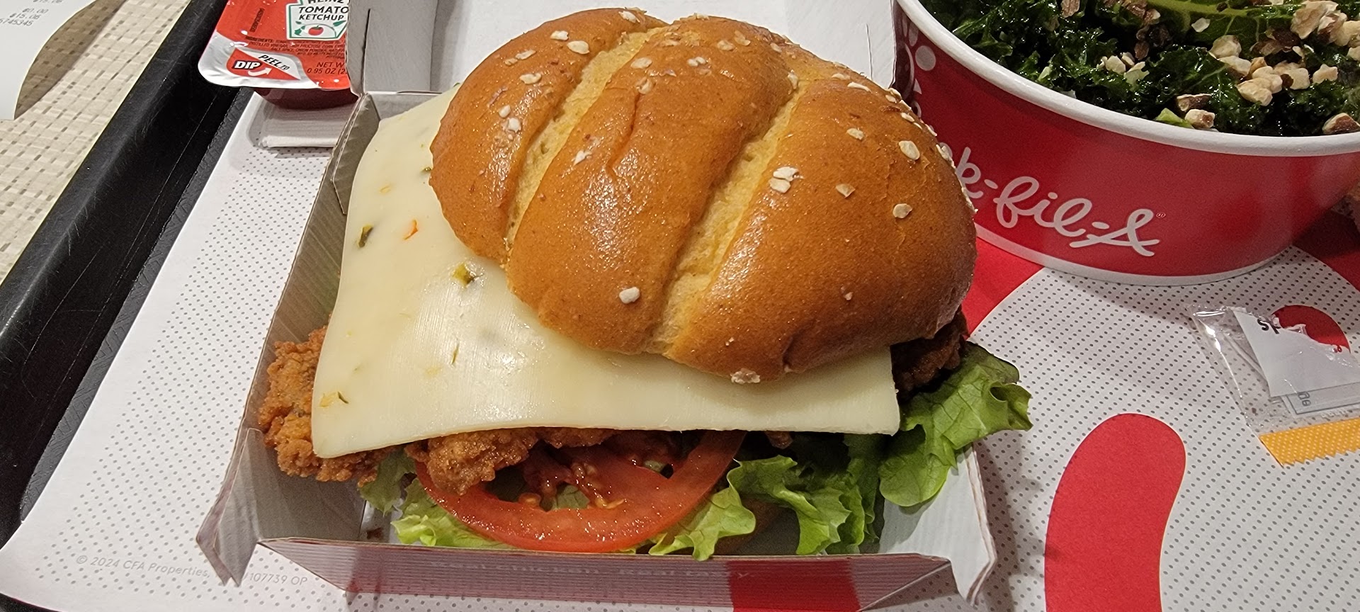 I ordered a multigrain brioche bun on a chicken sandwich. It was well seasoned and satisfying. The kale side salad was fabulous. It came with chopped almonds and already had a light vinegarette dressing. Once again, delicious!