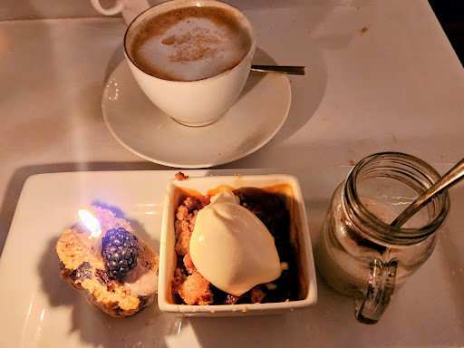 Our meal was five courses, with fresh bread and olive oil with herbs in it, followed by a tuna crudo with fruits, a squash stew with clams, rosemary venison with figs, wagyu steak with summer lasagna, and tiramisu with lemon ice cream (unexpected but divine!). The service was fantastic throughout. When one course took too long to come out, the servers comped a round of drinks for us. Jonathan, the owner, came around several times to check in on us and make sure everything was to our liking. Who does that?! When he realized it was our anniversary, he brought out an extra small plate of dessert with a candle for us--just to make us feel extra special. After the meal, Jonathan spent a while chatting with us, and just was the nicest guy, taking a genuine interest in us and our story. He went out of his way to get to know us. He even sent us home with an anniversary gift to help close out the night and really make it special. It really felt like we were eating dinner at a close friend's house, with a friend we've known forever hosting us. My husband and I were floored.