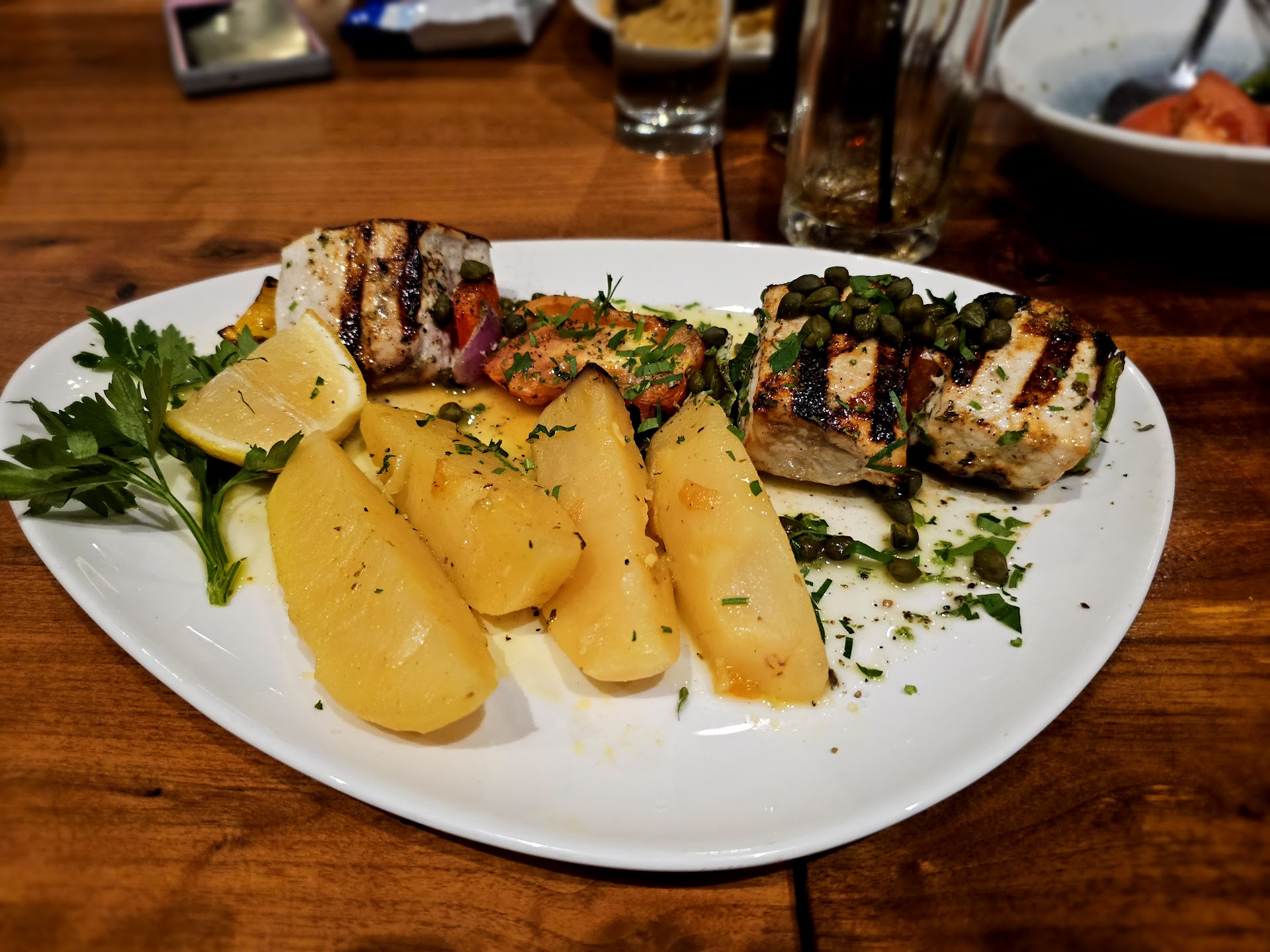My girlfriend enjoyed the fried calamari and we both liked the limani chips. The Greek salad is peppers, tomatoes, onions and cucumbers roughly chopped and dressed with a chunk of feta. I found out that this is actually a traditional Greek salad and quite authentic - notwithstanding I was not a tremendous fan -- mainly because too many tomatoes makes my mouth itch -- not the restaurant's fault on that one.