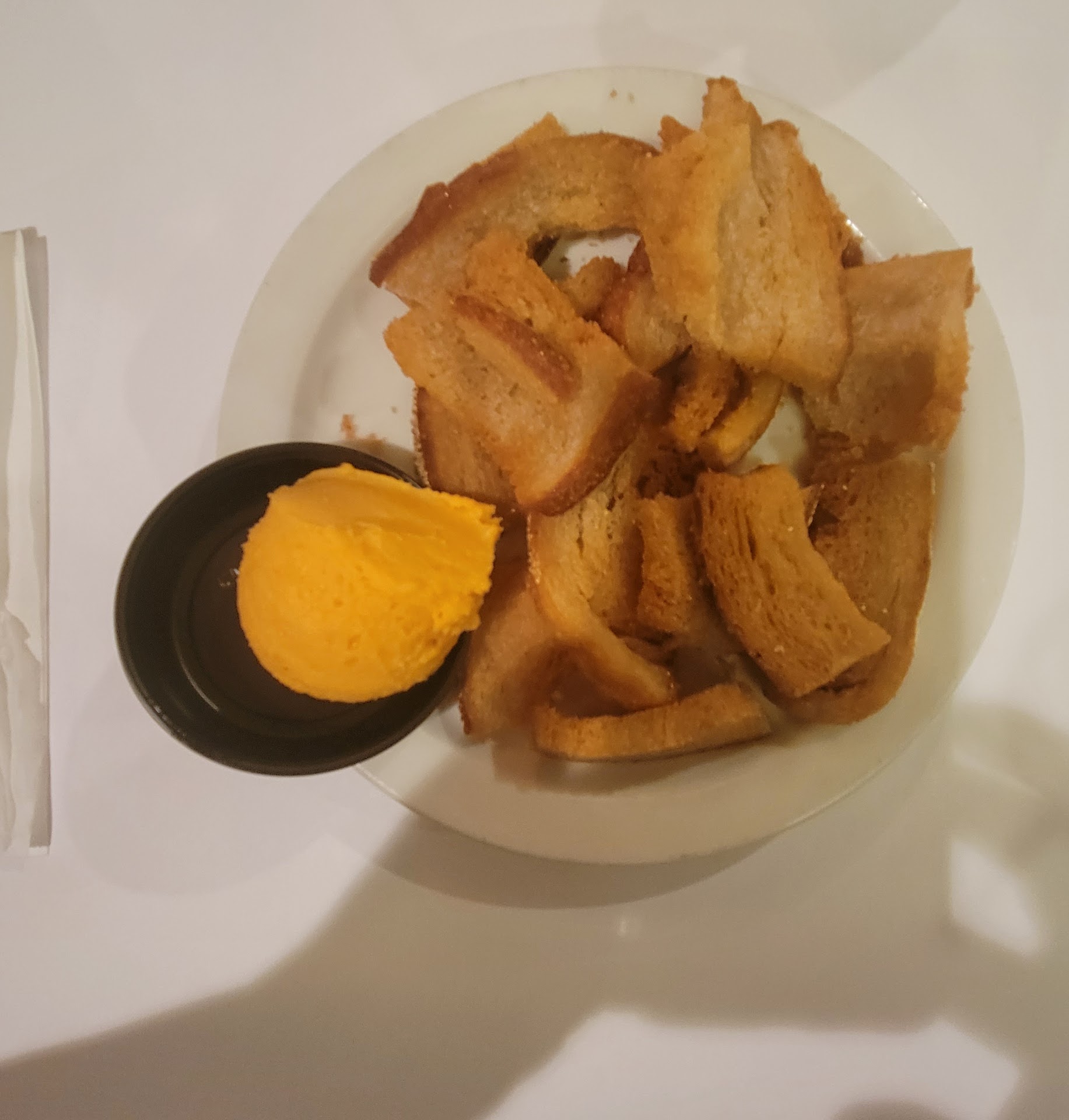 Read moreThis restaurant is in a strip mall, with a busy parking lot. You walk into the bar side, which on a Friday night was very crowded and very noisy. You have to walk through the crowd to get to the restaurant podium. We had reservations, and were seated immediately. Our server, Jenna, pleasantly arrived to take our drink order. A complimentary plate of fried bread with a pub cheese spread was served. We ordered the baked clam for an appetizer. Not the nest we've had, but not the worst. A nice crust on top, with chopped clams in the mixture, alon with pieces of bacon. My husband ordered the Old Street Chicken, basically chicken cordon bleu. He chose a salad instead of soup and fries as a side. He really enjoyed the batter fried chicken, covered with ham and Swiss. I ordered the stuffed shrimp and chose soup, French onion, along with rice pilaf as a side. The french onion soup had a dark, rich broth, and was delicious. The shrimp was stuffed with a crab meat mixture and very good. Jenna provided great service, we never had to ask for a drink refill. The menu had enough of a selection to peak our interest for us to...