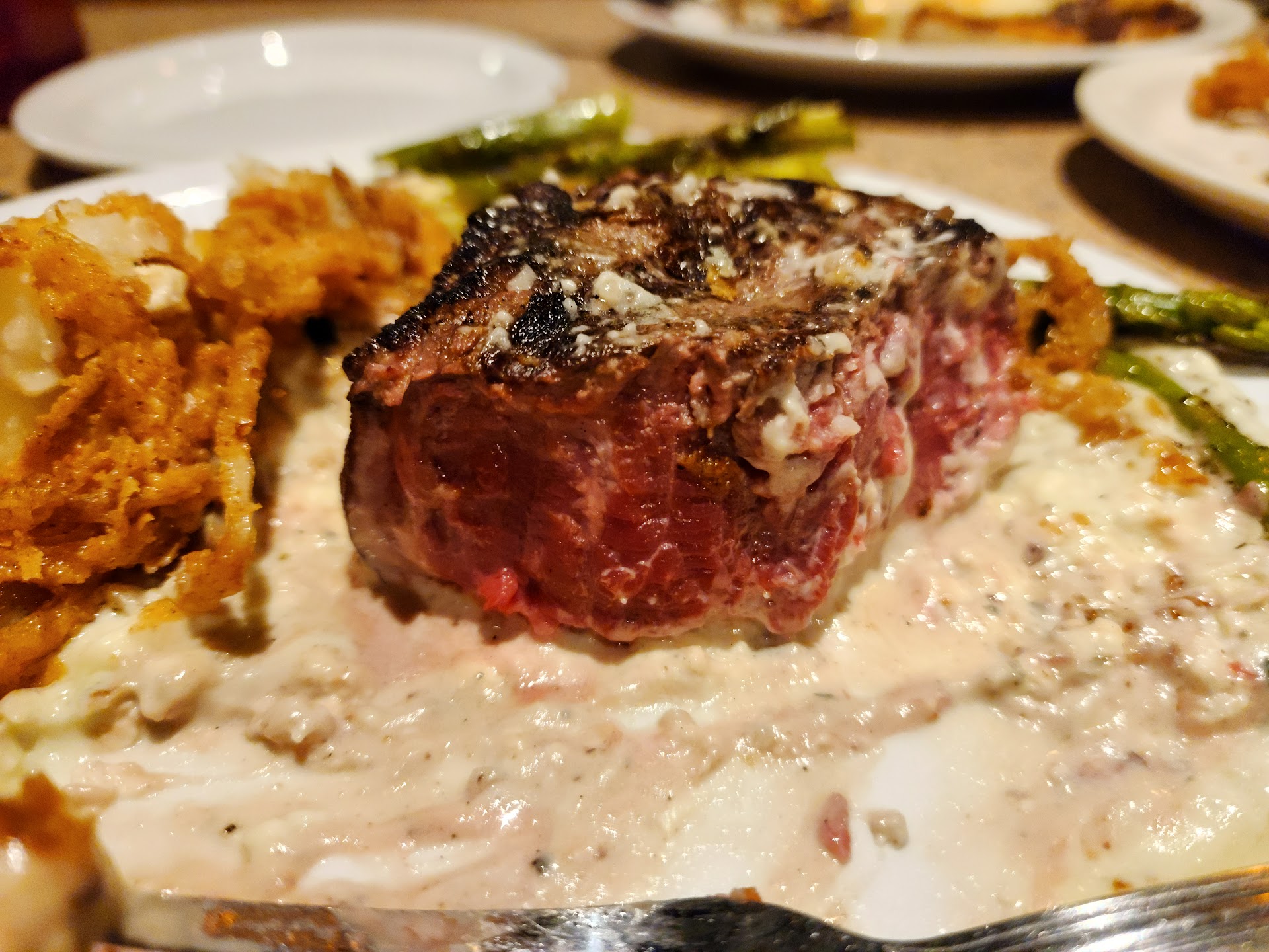 The French Onion soup is a favorite, lots of gooey cheese, melted over the sides, requiring the use of a knife to pry the melted crispier cheese off the sides. The soup itself tastes best when hot, which may not always be the case when served (I guess it is a long walk from the kitchen). The soup itself is good but it would be tastier if the ingredients were fresher. A perfect opportunity for the chef to improve the taste with very little increase in cost or effort.