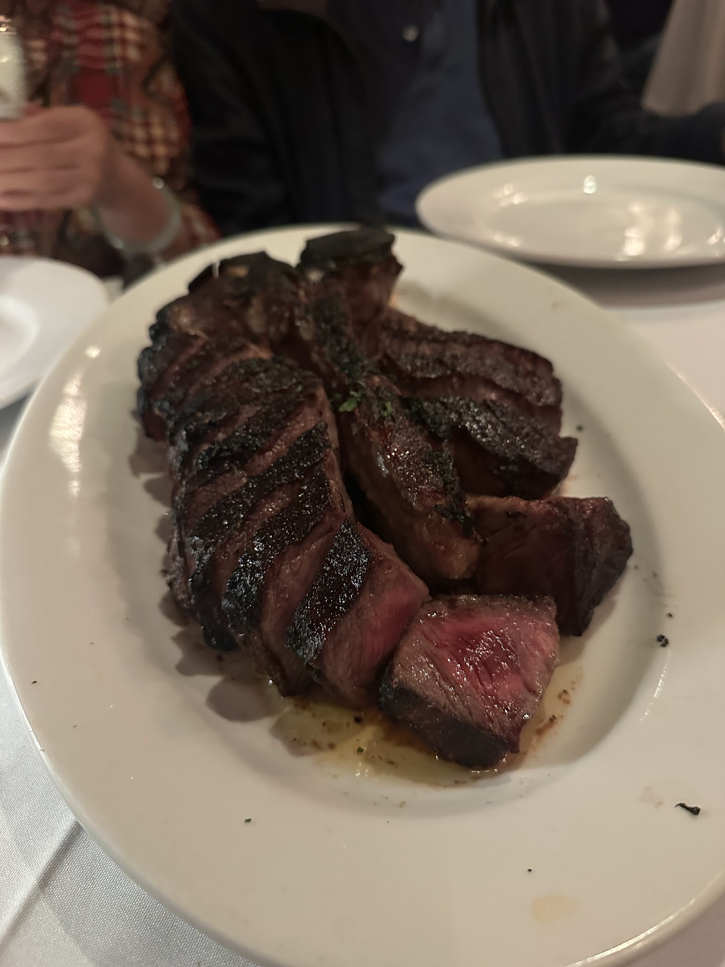 Ambiance (5/5): The inside reminds me of a nicely decorated home-- walls lined with mirrors and paintings, nice ceiling lighting, mood lighting, moderately fancy dining setting. The inside is moderately loud with the establishment divided into 3 different areas, one shared with the bar. We sat in a booth which proved to be a fairly tight space and dimly lit. Service (5/5): We visited during Father’s Day. I’m not sure if it is typical or not, but we had two dedicated servers (Sarah and Conor?) throughout our whole dining experience. As such, we felt attended to 100% throughout our entire experience. Both were delightful in providing us not only prompt but also courteous treatment. Other bussing services came around to refill waters and clear out tables appropriately as well. Manager came to check in toward the end of the experience too! Food Table Bread (5/5): The toasted buttered and seasoned bread was phenomenal. It was fresh and not too toasted that it was soft yet crispy. There were also some included crackers along with a small side of whipped butter. Side of salad (5/5): The choice of variety of dressings. The creamy cucumber dressing (recommended by our server) did not disappoint. I was very happy that the salad was generous in the variety in all kinds of fresh vegetables. Our table opted for 2 of the day’s specials: 1 appetizer: Pace’s Slab Bacon (5/5) had a very smoky taste and the taste was not the same without all elements presented on the plate: tomato, white onion, and tomato spread. Enjoyed together, the bite was delicious. Stuffed Salmon (3/5): The salmon was very tender and the stuffed component has a very mushy texture. With the sauce providing a very creamy and buttery aftertaste to the meal. It was so rich that without a base of starch (like rice or pasta) or any vegetables for that matter, I need something to soak up the rest. However, very filling and deliciously seasoned. The lack of any sides kind of left me wanting more even for an entrée. Porterhouse for 2 (3/5): The biggest disappointment for us was the porterhouse. I think we were at least expecting it to be cooked to our liking which was supposed to be “medium” and it was definitely on the “medium-rare” side. The meat itself was pretty tough to chew/cut/eat and hardly seasoned to enjoy on it’s own unlike other steaks we’ve had. The charring tastes did not come through. We were plenty full after just ordering 1 app and 2 dishes for our party of 4. Overall, the service was...