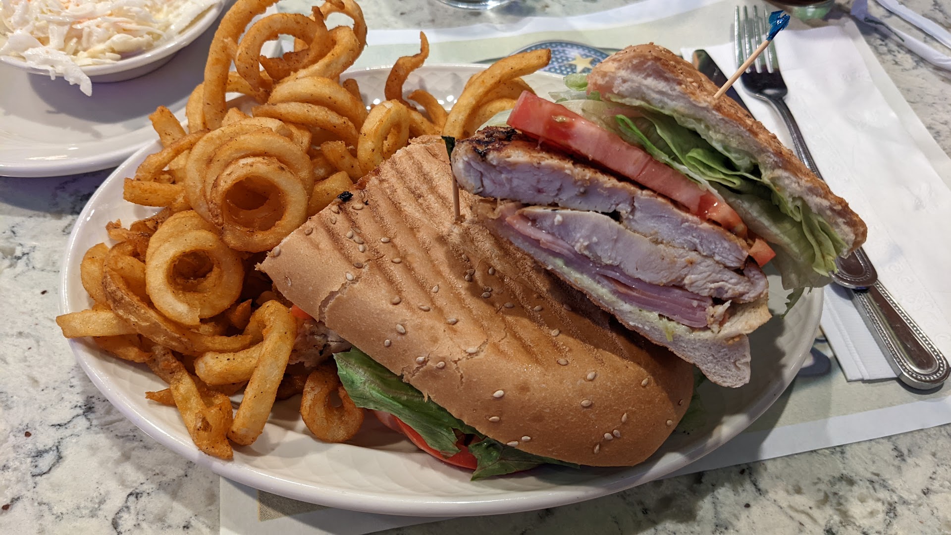 I had to flag her down again and say that I no longer wanted that or different chicken. Instead, I requested a basic grilled cheese (hard to mess up). When she brought this dish out, she mentioned that the best she could do to compensate me for this (remember, I wound up eating raw chicken before realizing it) was combine my side or curly fries into a meal with the grilled cheese, saving me $6 of the $20+ from my meal.